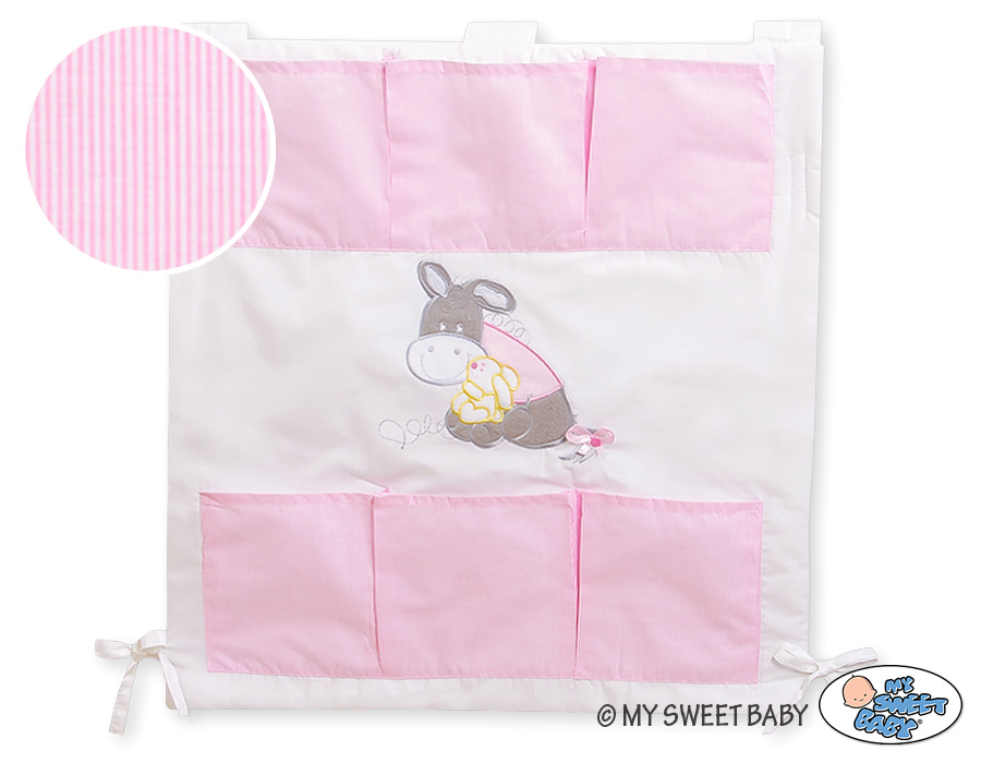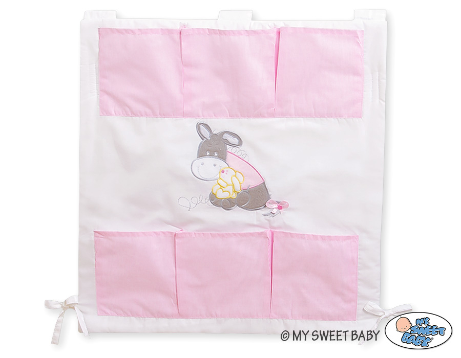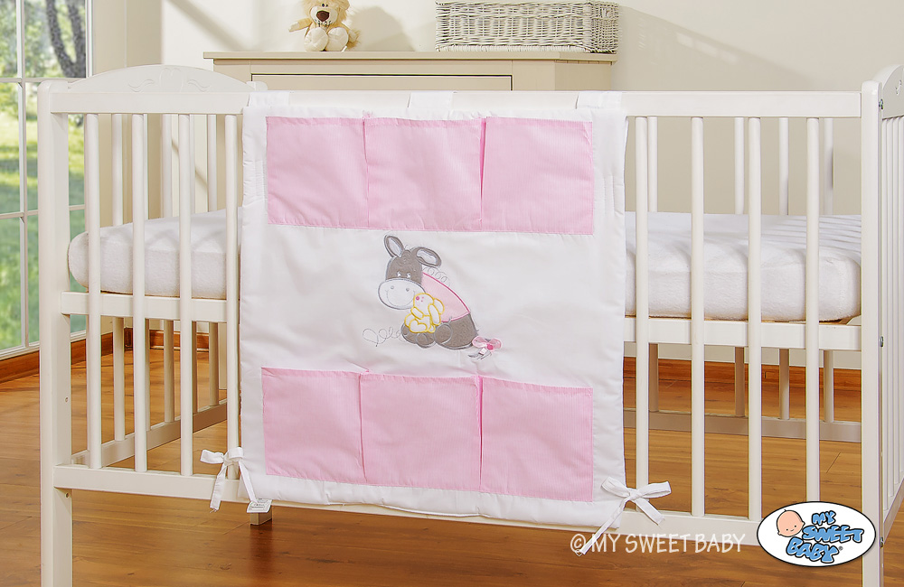 Kinderbett-Tasche - Esel Luca rosa Betttasche mit 6 praktischen Aufbewahrungstaschen für Spielzeug, Windeln, Feuchttücher, Schnuller. Das Kuscheltier finden hier auch Platz.