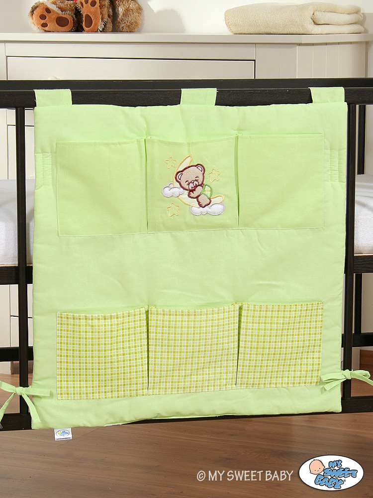 Kinderbett-Tasche grün - Gute Nacht Betttasche mit 6 praktischen Aufbewahrungstaschen für Spielzeug, Windeln, Feuchttücher, Schnuller. Das Kuscheltier finden hier auch Platz.