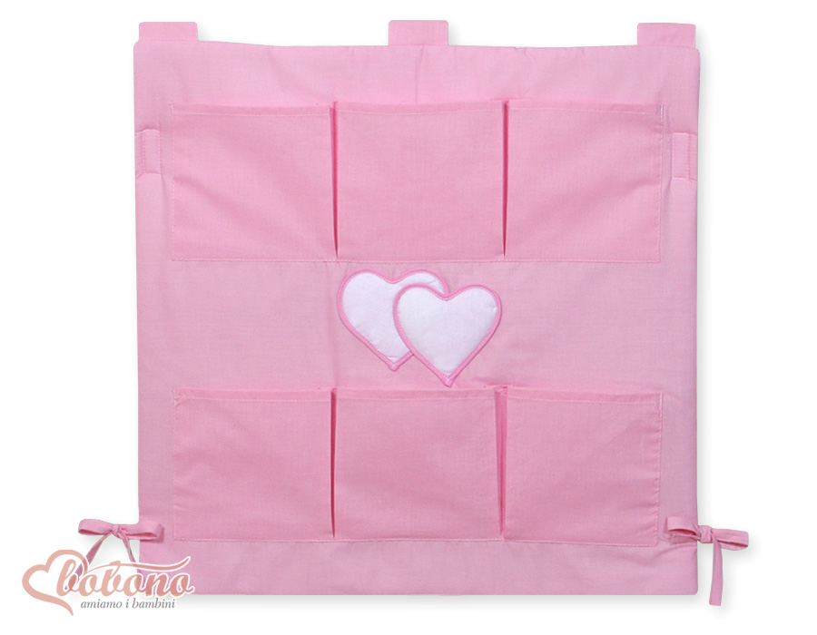 Kinderbett Tasche - Hängende Herzen rosa Betttasche mit 6 praktischen Aufbewahrungstaschen für Spielzeug, Windeln, Feuchttücher, Schnuller. Das Kuscheltier finden hier auch Platz.