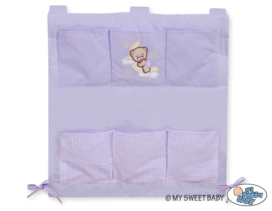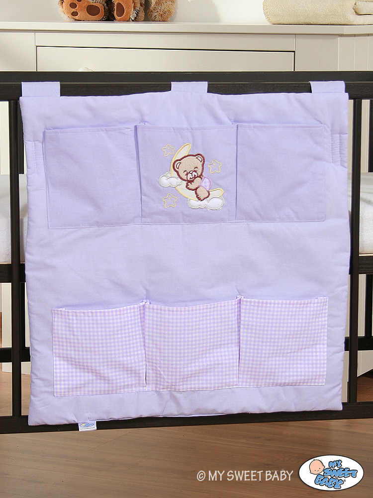 Kinderbett-Tasche lila - Gute Nacht Betttasche mit 6 praktischen Aufbewahrungstaschen für Spielzeug, Windeln, Feuchttücher, Schnuller. Das Kuscheltier finden hier auch Platz.