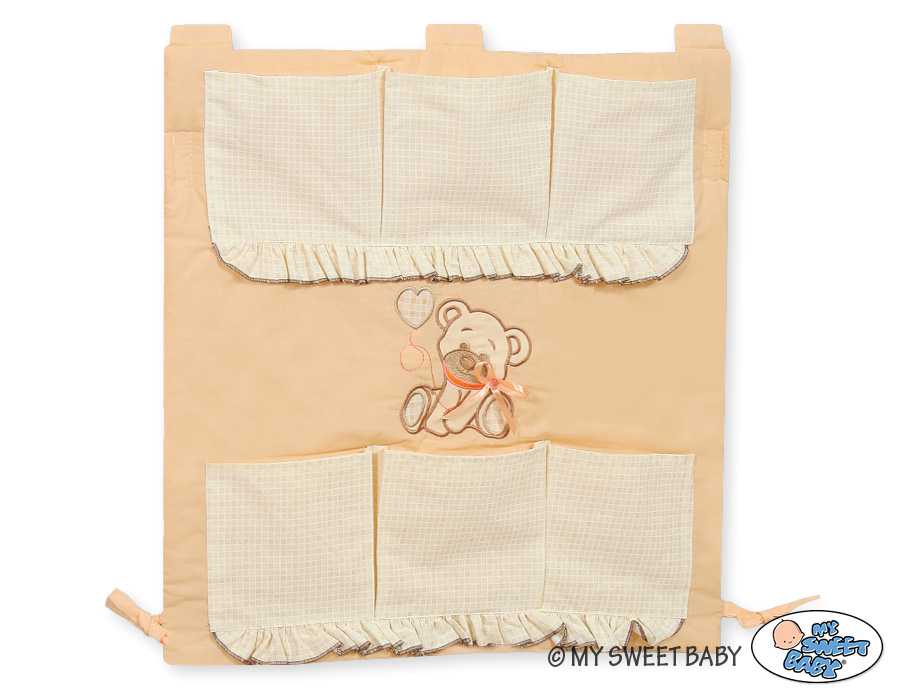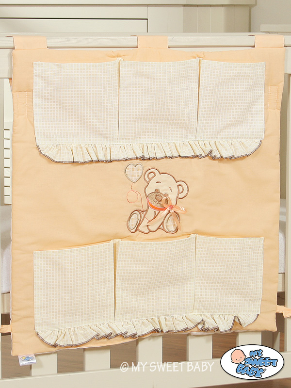 Kinderbetttasche - Bär mit Schleife pfirsich Betttasche mit 6 praktischen Aufbewahrungstaschen für Spielzeug, Windeln, Feuchttücher, Schnuller. Das Kuscheltier finden hier auch Platz.