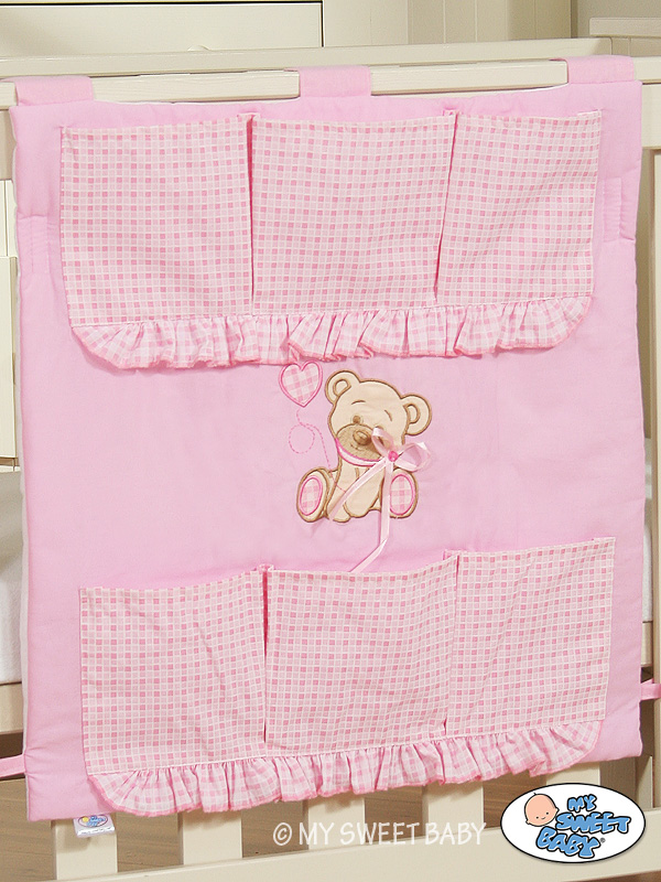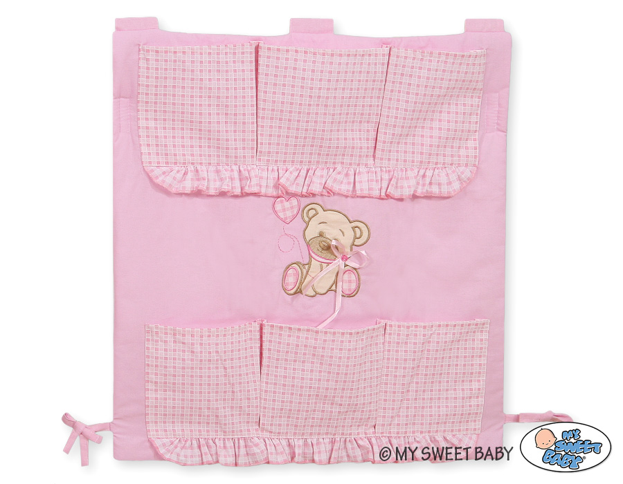 Kinderbetttasche - Bär mit Schleife rosa Betttasche mit 6 praktischen Aufbewahrungstaschen für Spielzeug, Windeln, Feuchttücher, Schnuller. Das Kuscheltier finden hier auch Platz.