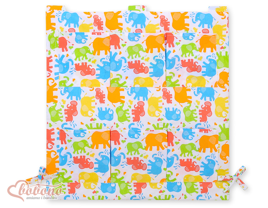 Kinderbetttasche - bunte Elefanten Betttasche mit 6 praktischen Aufbewahrungstaschen für Spielzeug, Windeln, Feuchttücher, Schnuller. Das Kuscheltier finden hier auch Platz.