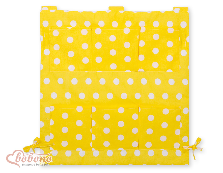 Kinderbetttasche - Gelb mit Tupfen Betttasche mit 6 praktischen Aufbewahrungstaschen für Spielzeug, Windeln, Feuchttücher, Schnuller. Das Kuscheltier finden hier auch Platz.