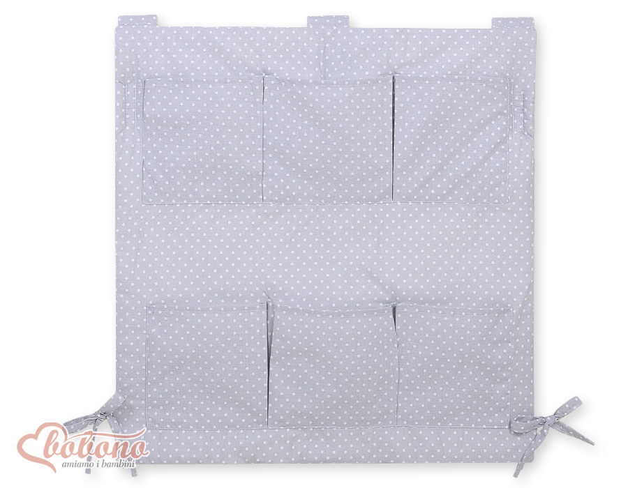 Kinderbetttasche - Grau-Punktemuster Betttasche mit 6 praktischen Aufbewahrungstaschen für Spielzeug, Windeln, Feuchttücher, Schnuller. Das Kuscheltier finden hier auch Platz.