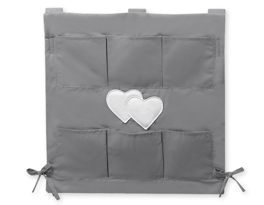 Kinderbetttasche - Hängende Herzen anthrazit Betttasche mit 6 praktischen Aufbewahrungstaschen für Spielzeug, Windeln, Feuchttücher, Schnuller. Das Kuscheltier finden hier auch Platz.