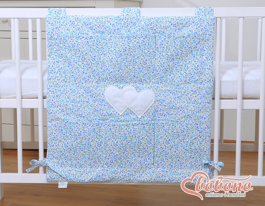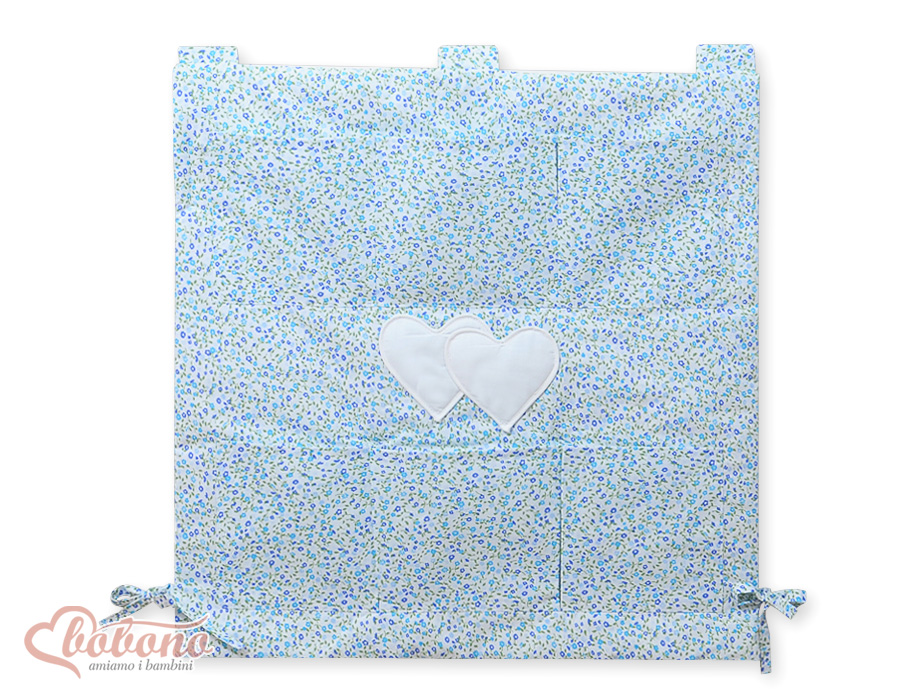 Kinderbetttasche - Hängende Herzen blaue Blümchen Betttasche mit 6 praktischen Aufbewahrungstaschen für Spielzeug, Windeln, Feuchttücher, Schnuller. Das Kuscheltier finden hier auch Platz.