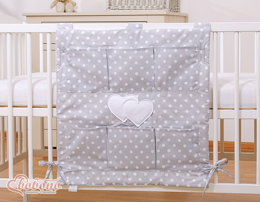 Kinderbetttasche - Hängende Herzen Grau - Punktemuster Betttasche mit 6 praktischen Aufbewahrungstaschen für Spielzeug, Windeln, Feuchttücher, Schnuller. Das Kuscheltier finden hier auch Platz.
