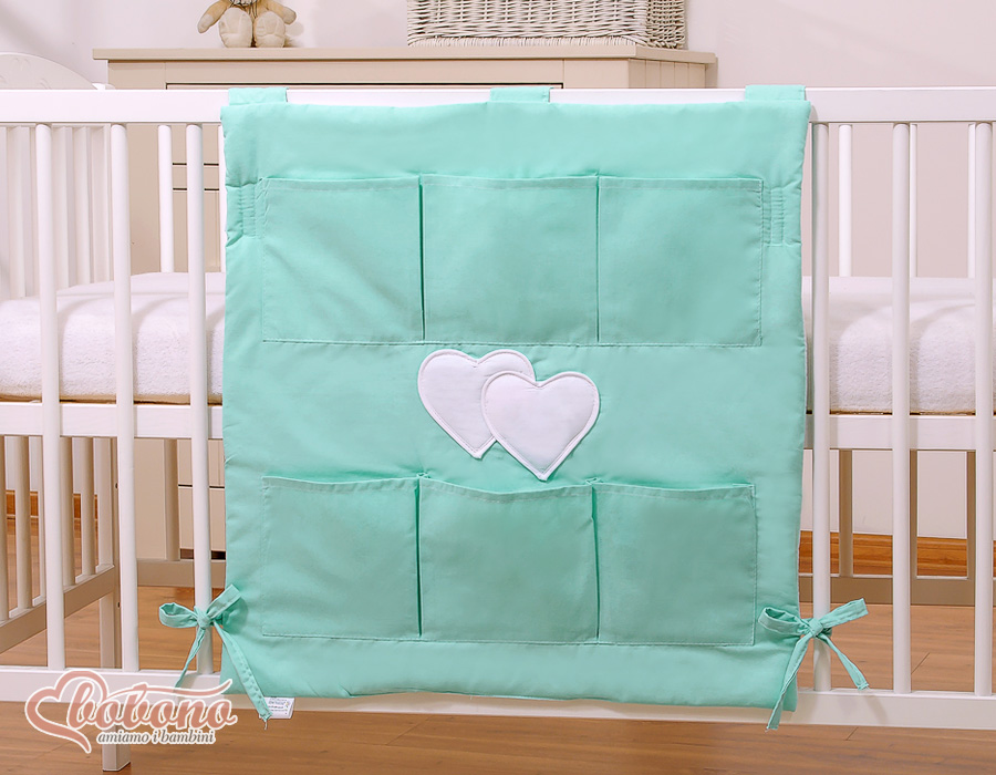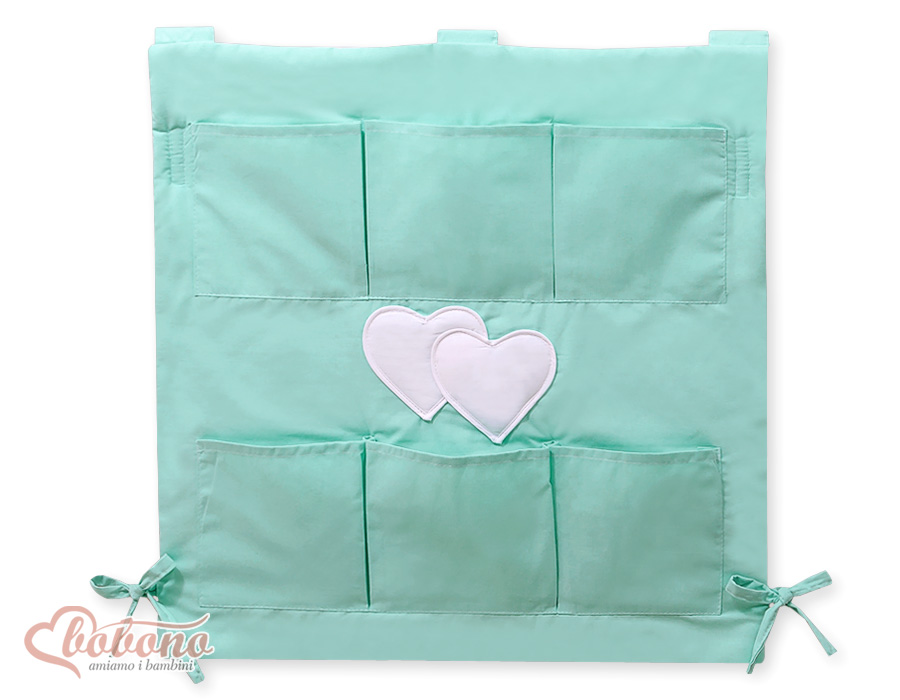 Kinderbetttasche - Hängende Herzen Minze Betttasche mit 6 praktischen Aufbewahrungstaschen für Spielzeug, Windeln, Feuchttücher, Schnuller. Das Kuscheltier finden hier auch Platz.