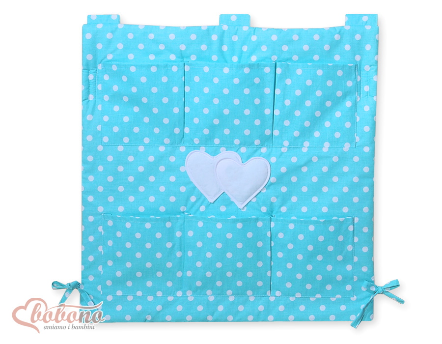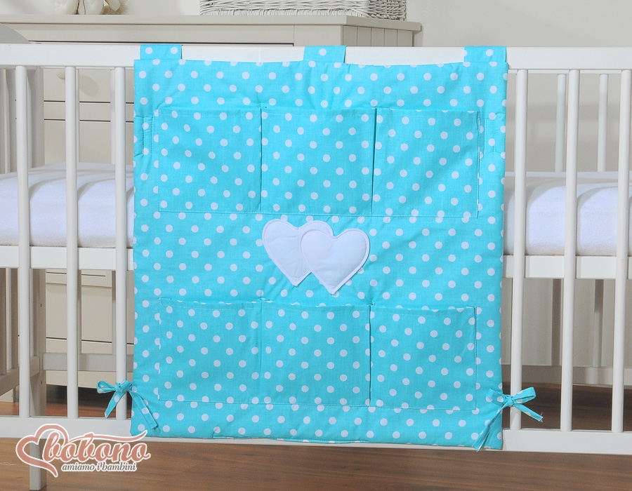 Kinderbetttasche - Hängende Herzen Türkis - Punktemuster Betttasche mit 6 praktischen Aufbewahrungstaschen für Spielzeug, Windeln, Feuchttücher, Schnuller. Das Kuscheltier finden hier auch Platz.