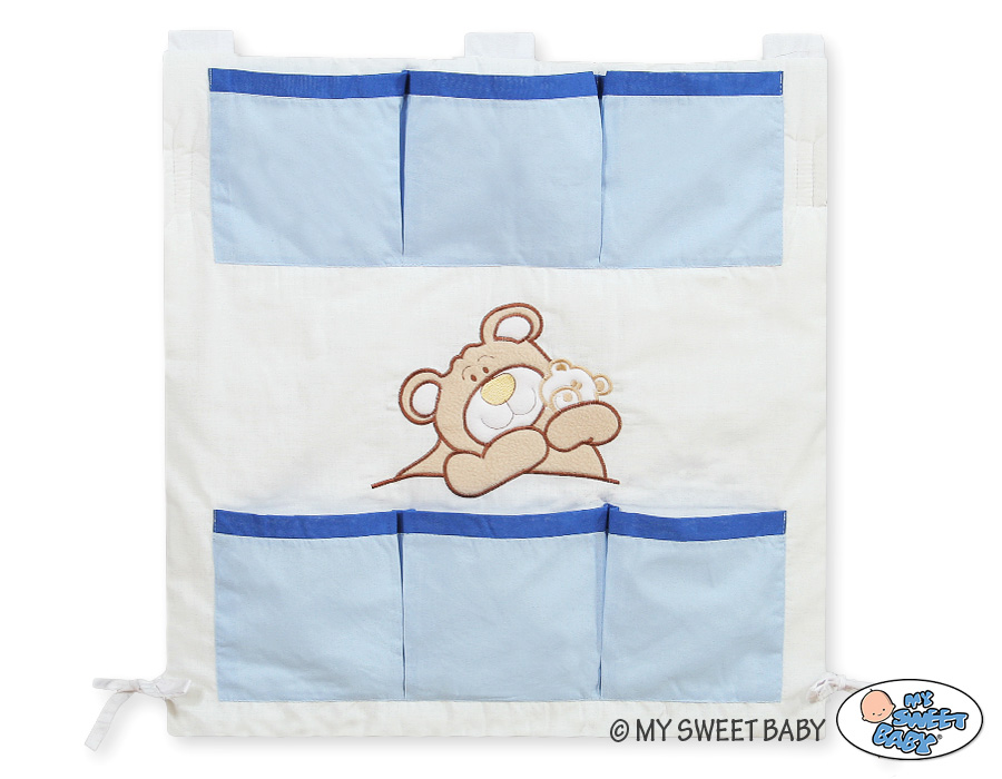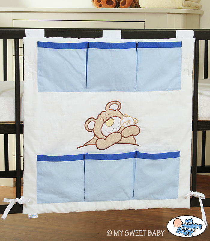Kinderbetttasche - Teddy Bär Barnaba blau Betttasche mit 6 praktischen Aufbewahrungstaschen für Spielzeug, Windeln, Feuchttücher, Schnuller. Das Kuscheltier finden hier auch Platz.