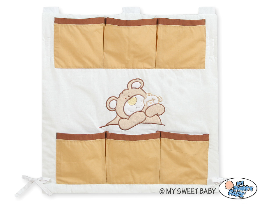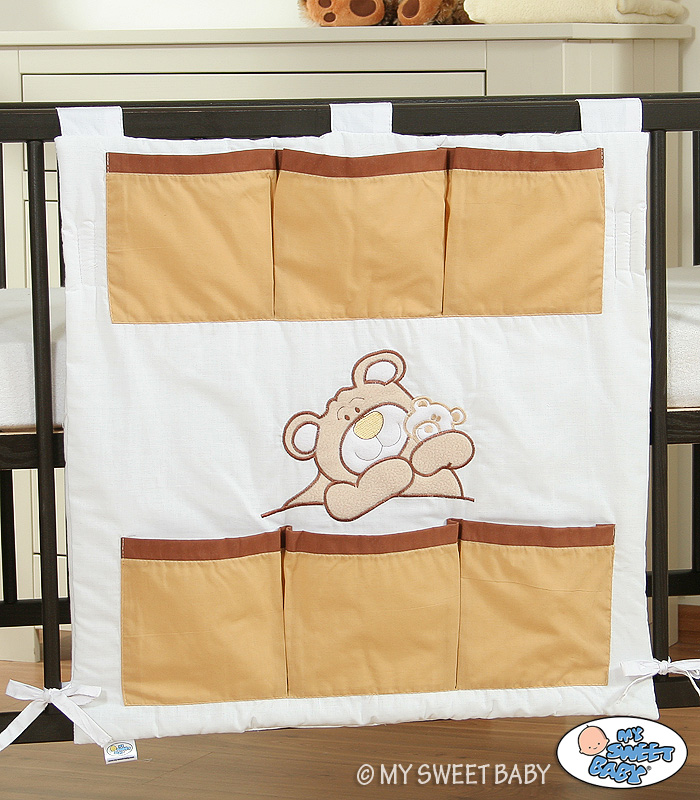 Kinderbetttasche - Teddy Bär Barnaba braun Betttasche mit 6 praktischen Aufbewahrungstaschen für Spielzeug, Windeln, Feuchttücher, Schnuller. Das Kuscheltier finden hier auch Platz. Kinderbetttaschemit Applikation- Kollektion Teddy Bär Barnaba
