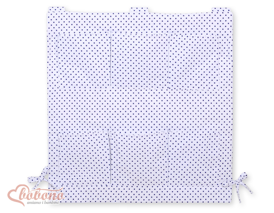 Kinderbetttasche - weis mit Dunkelblau-Punktemuster Betttasche mit 6 praktischen Aufbewahrungstaschen für Spielzeug, Windeln, Feuchttücher, Schnuller. Das Kuscheltier finden hier auch Platz.