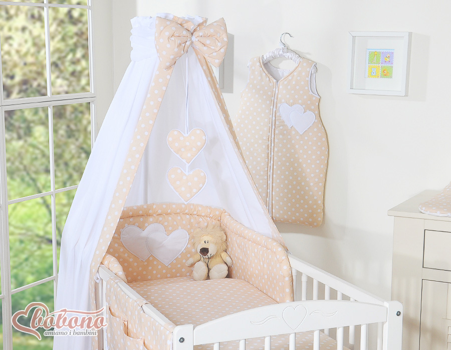 Kinderbettwäsche-Set 11-tlg mit Himmel - Hängende Herzen Beige-Punktemuster
