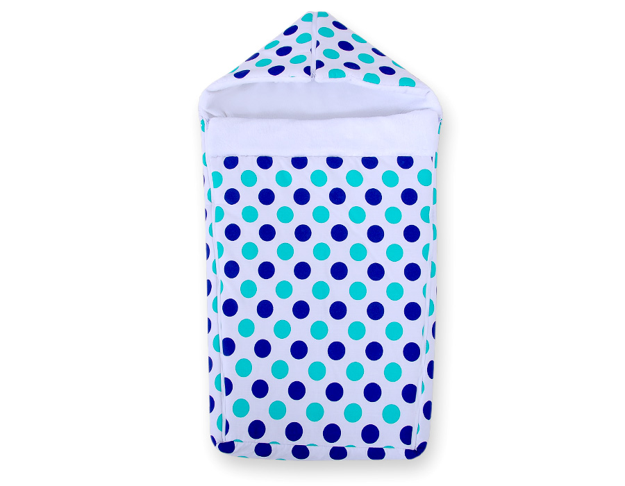 Kinderwagen-Schlafsack - Dunkelblau-minze Tupfen Ein weicher, flauschiger, großer und bequemer Kinderwagenschlafsack/Fußsack für kältere Tage aus 3 Materialschichten hergestellt. Garantiert eine lange Nutztung.