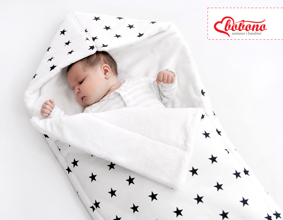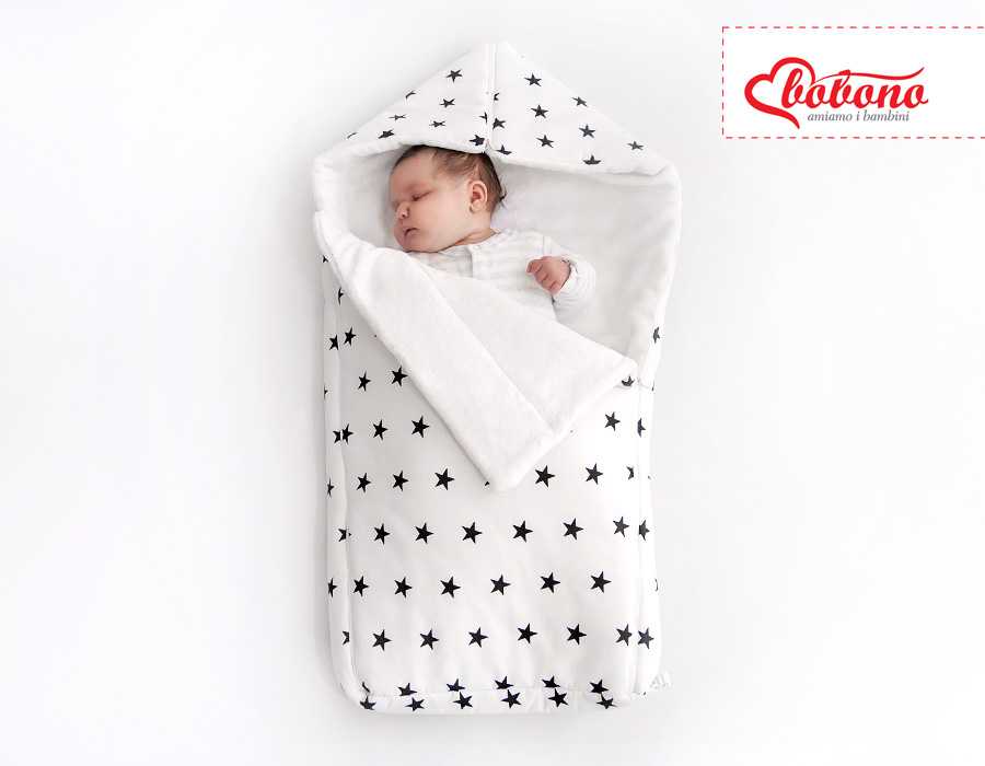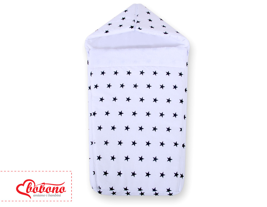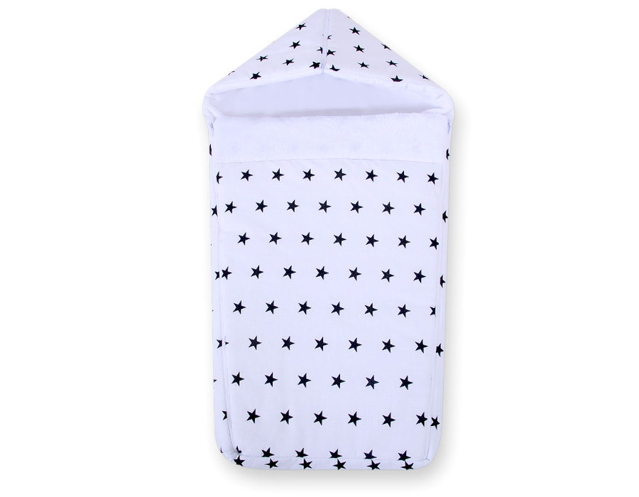 Kinderwagen Schlafsack - Schwarze Sternchen Ein weicher, flauschiger, großer und bequemer Kinderwagenschlafsack/Fußsack für kältere Tage aus 3 Materialschichten hergestellt. Garantiert eine lange Nutztung.