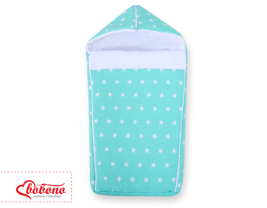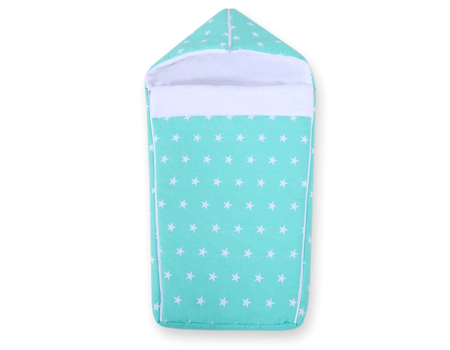 Kinderwagen Schlafsack - Sternchen minze Ein weicher, flauschiger, großer und bequemer Kinderwagenschlafsack/Fußsack für kältere Tage aus 3 Materialschichten hergestellt. Garantiert eine lange Nutztung.