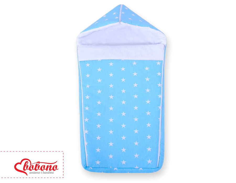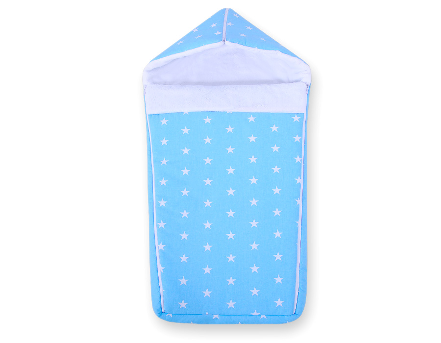 Kinderwagenschlafsack - Blaue Sternchen Ein weicher, flauschiger, großer und bequemer Kinderwagenschlafsack/Fußsack für kältere Tage aus 3 Materialschichten hergestellt. Garantiert eine lange Nutztung.