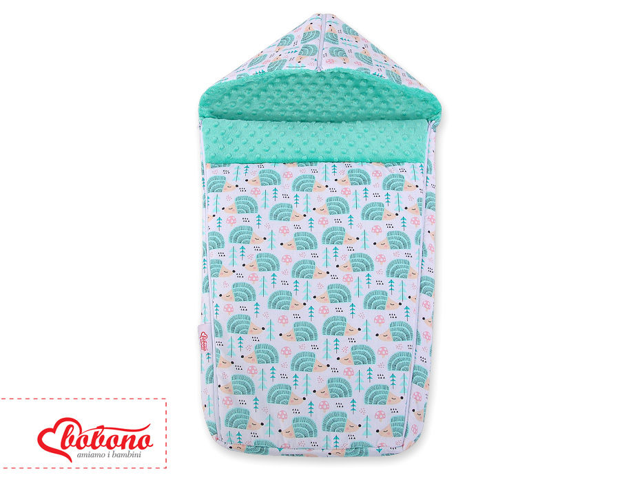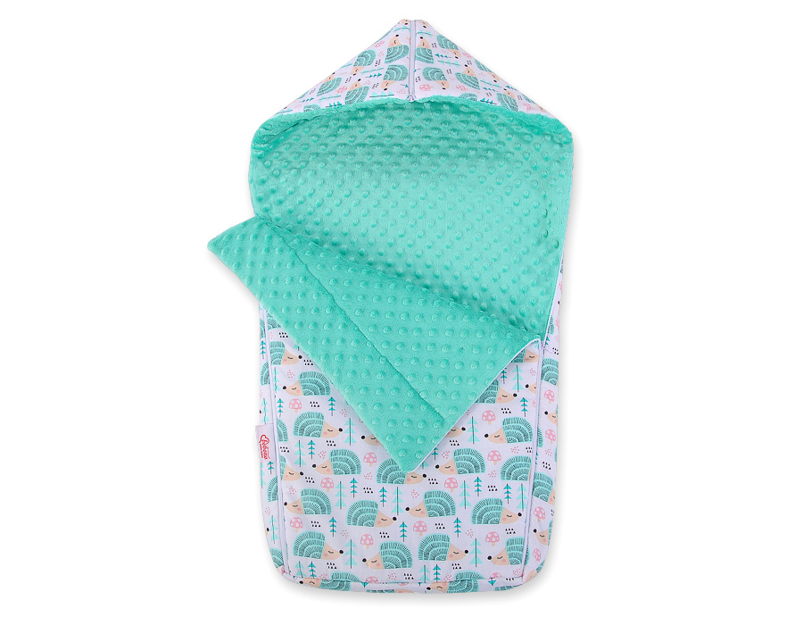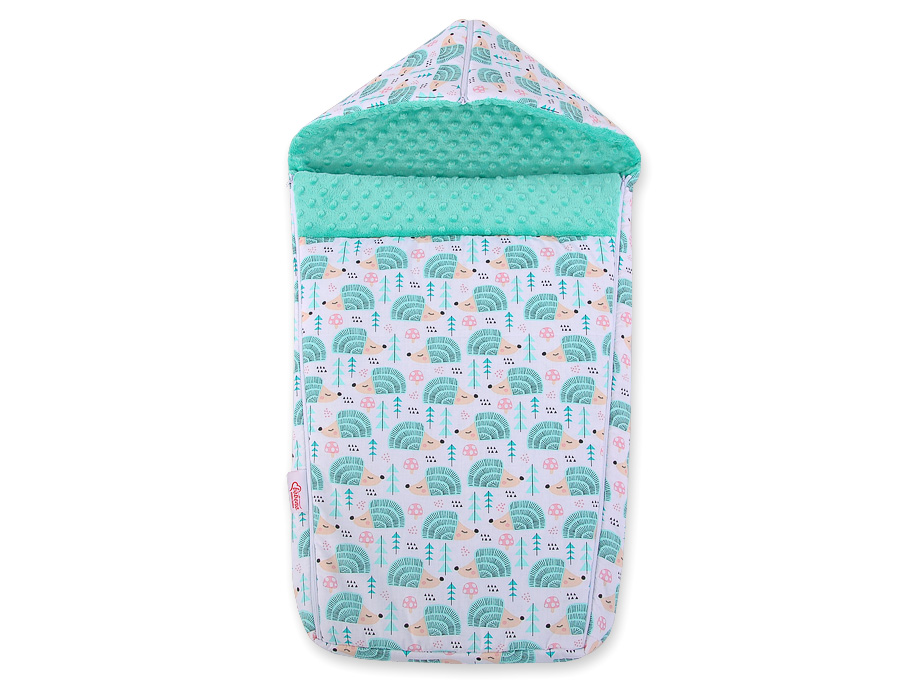 Kinderwagenschlafsack - Igel mint Ein weicher, flauschiger, großer und bequemer Kinderwagenschlafsack/Fußsack für kältere Tage aus 3 Materialschichten hergestellt. Garantiert eine lange Nutztung.