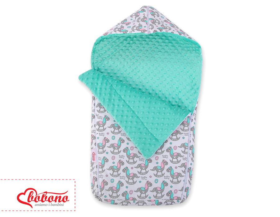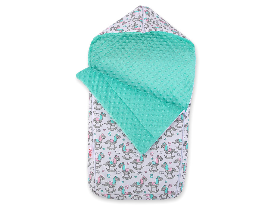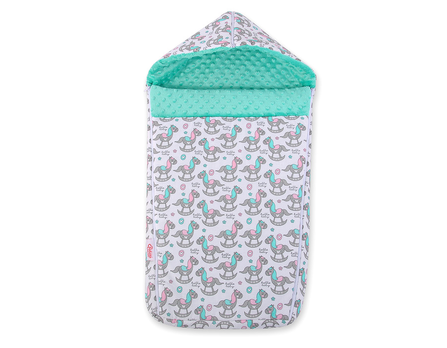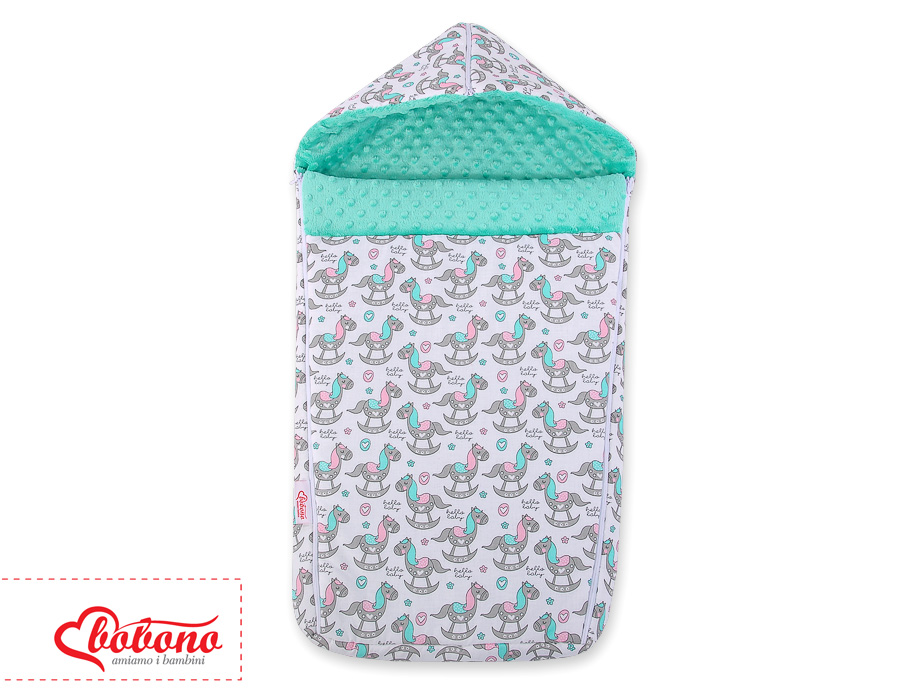 Kinderwagenschlafsack - Schaukelpferde Ein weicher, flauschiger, großer und bequemer Kinderwagenschlafsack/Fußsack für kältere Tage aus 3 Materialschichten hergestellt. Garantiert eine lange Nutztung.
