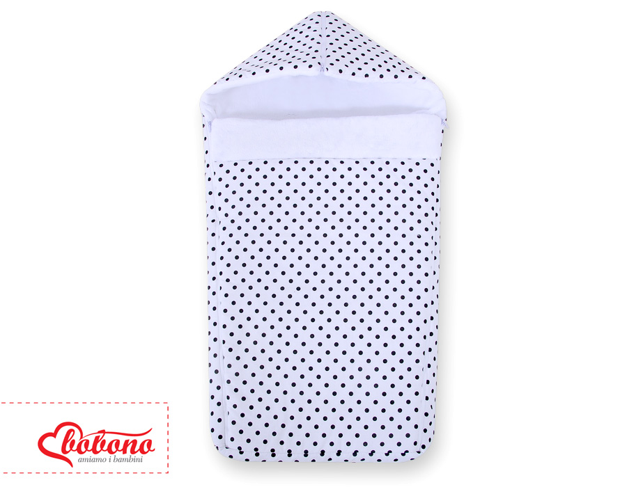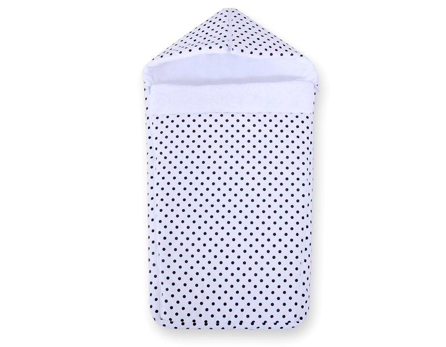 Kinderwagenschlafsack - Weiß mit Schwarz-Punktemuster Ein weicher, flauschiger, großer und bequemer Kinderwagenschlafsack/Fußsack für kältere Tage aus 3 Materialschichten hergestellt. Garantiert eine lange Nutztung.