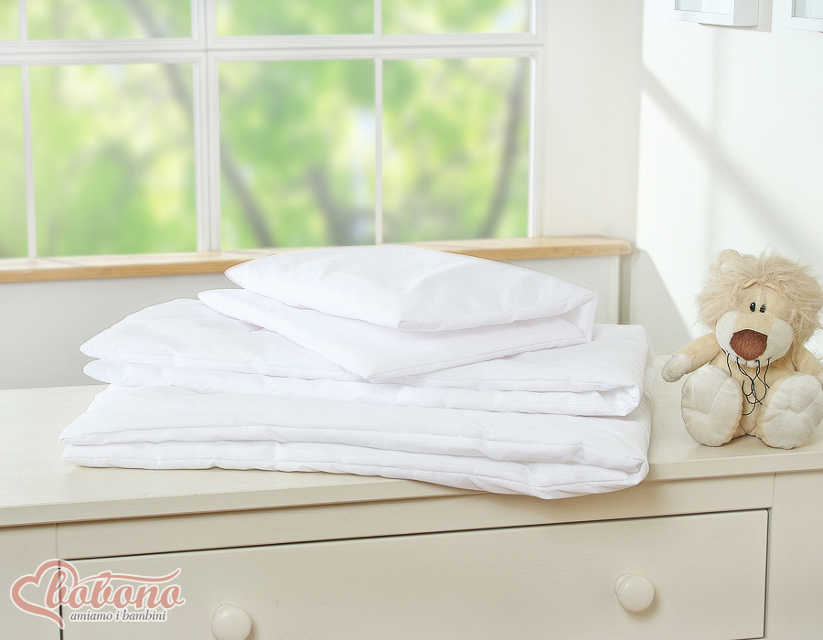Kissen und Decke (Füllung) für Babybett STANDARD 100x135cm Kuschelige,bequeme Decke und Kopfkissen für einen erholsamen Schlaf. Das Set ist allergieneutral, äußerst pflegeleicht und angenehm.