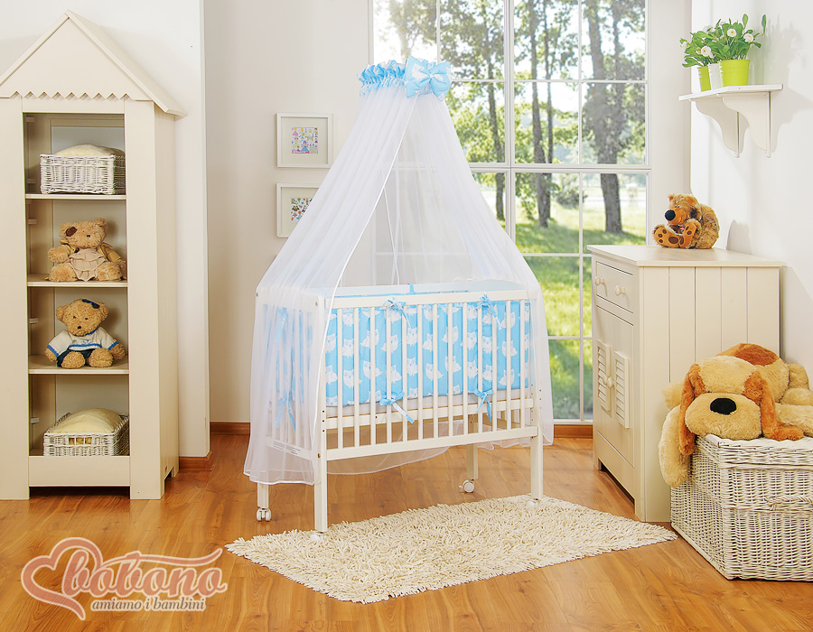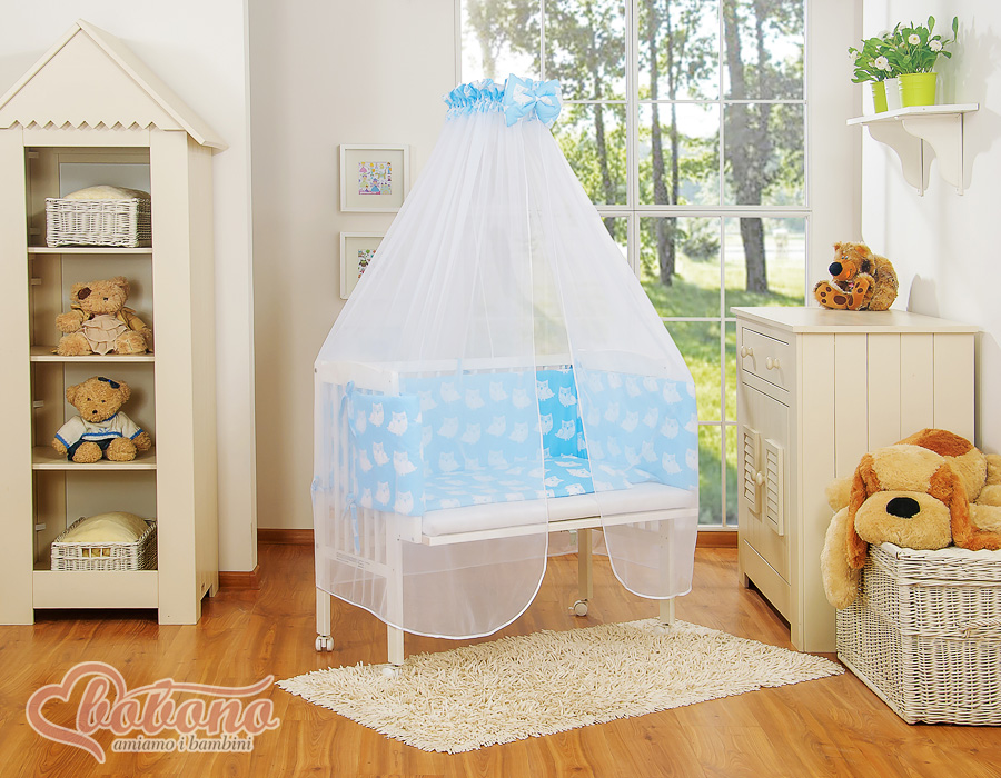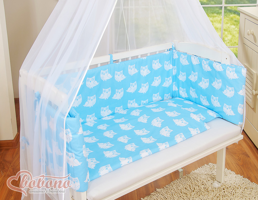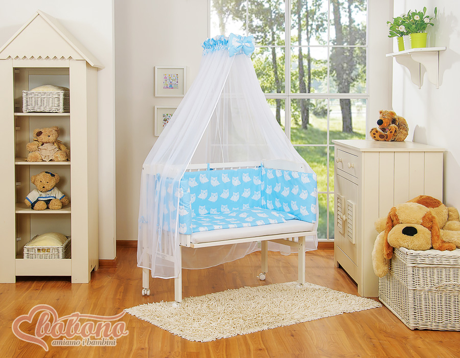 Komplett Beistellbett FABIO mit Matratze und Bettwäsche Set - Basic Eulen blau Wir präsentieren Ihnen wunderschönes Beistellbettchen welches aus schadstofffreien Materialien angefertigt wurde. Erfüllt die gültigen EU Normen.