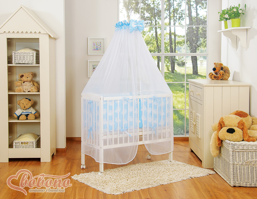 • Beistellbettchen ( 4 Seiten+ Beistellbrettchen mit höheren Seiten und Metallbefestigung an das Elternbett) • Premiummatratze 2 Teilig mit abnehmbaren Bezug • 4 Plastikräder mit Bremsen • Textilien (Bettwäsche, Kissen und Decke, Kopfschutz, , Himmel mit Schleife, Himmelstange) Abmessungen: L 94 cm, B 44/ 56 cm, H 85 cm Blau Eulen Basic Bettwäsche Matratze FABIO Beistellbett Komplette