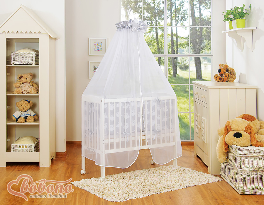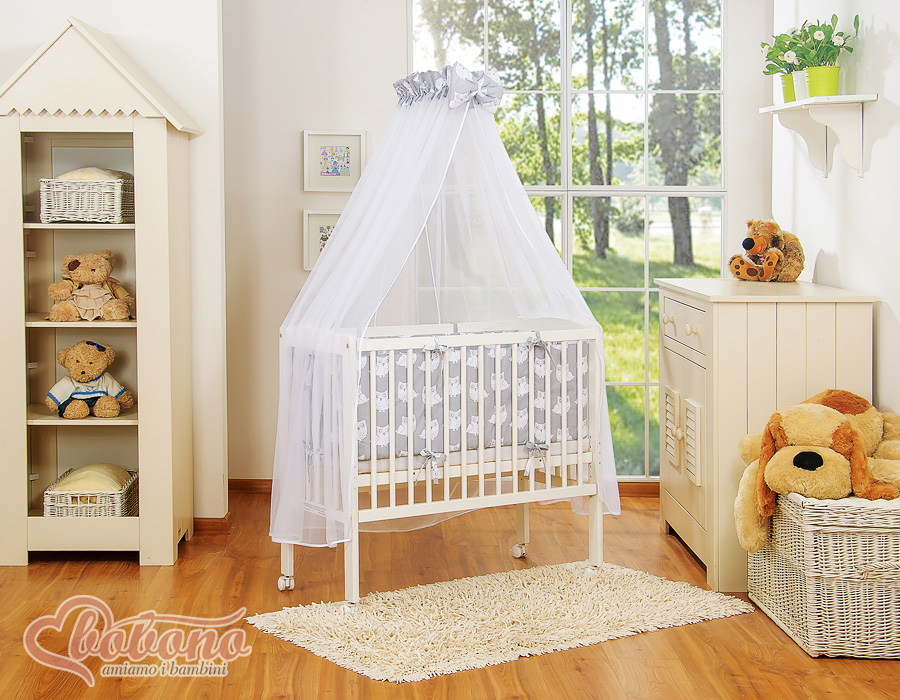 • Beistellbettchen ( 4 Seiten+ Beistellbrettchen mit höheren Seiten und Metallbefestigung an das Elternbett) • Premiummatratze 2 Teilig mit abnehmbaren Bezug • 4 Plastikräder mit Bremsen • Textilien (Bettwäsche, Kissen und Decke, Kopfschutz, , Himmel mit Schleife, Himmelstange) Abmessungen: L 94 cm, B 44/ 56 cm, H 85 cm Grau Eulen Basic Bettwäsche Matratze FABIO Beistellbett Komplette