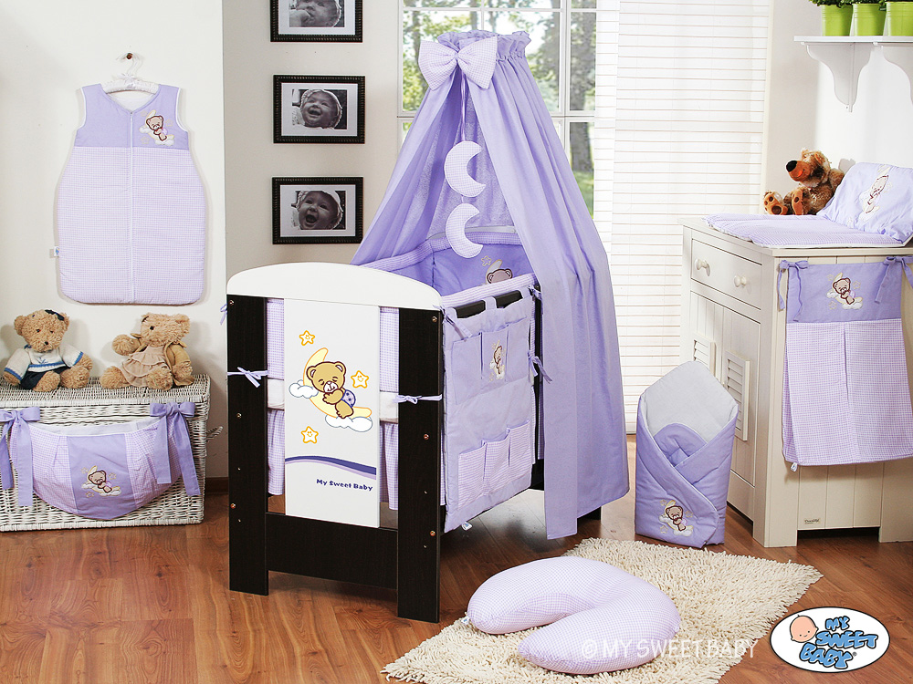 Stubenwagen » Bettwäsche für Babys » Bettwäsche für Babybett GUTE NACHT » Bettwäsche Sets für Babybett 120cm » Bettwäsche Set 11-tlg mit Himmel (L) » Komplett Bettwäsche Set 11-tlg mit Himmel(L60) - Gute Nacht lila