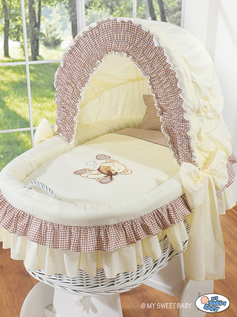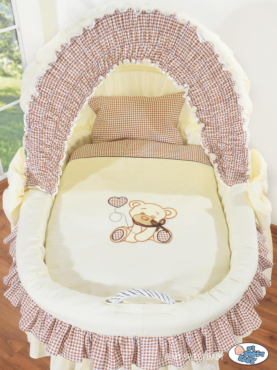Komplett Bollerwagen mit Bettwäsche mit Haube - Bär mit Schleife braun Eine ausgezeichnete Lösung für kleine Wohnungen oder Haus. Leise Räder ermöglichen eine einfache Einstellung des Korbs. Dank dessen ist das Kind immer bei dir.