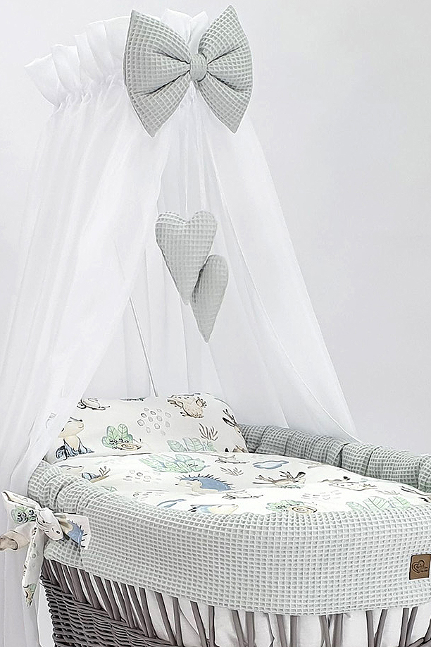 Unser Moseskorb mit Himmel ist mehr als nur ein Bett – er ist ein Kunstwerk aus natürlichen Materialien und jahrelanger Handwerkskunst. Jeder Korb wird von erfahrenen Händen aus polnischem Weidenholz geflochten und mit umweltfreundlicher Farbe bemalt, die den höchsten Standards entspricht. Das solide Holzgestell mit seinen drehbaren Rollen sorgt nicht nur für die Sicherheit Ihres Babys, sondern auch für eine mühelose Bewegung des Stubenwagens – egal, ob auf Parkett oder Fliesen.