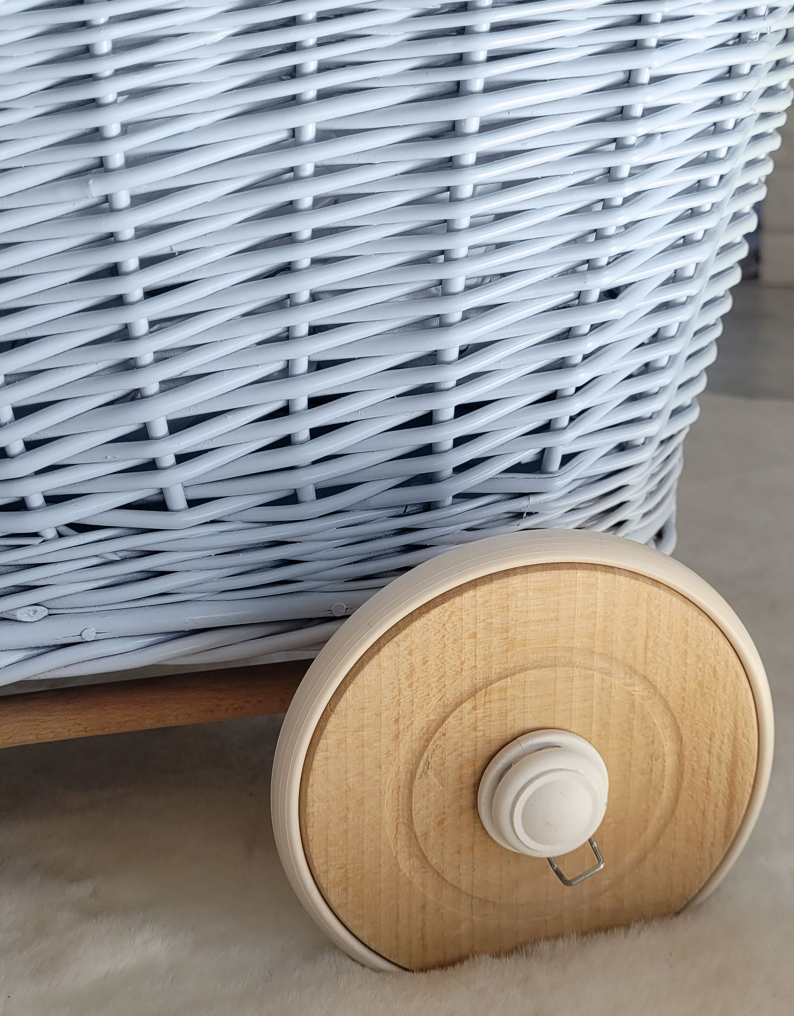 - Handgeflochtener Trolleykorb aus ökologischem Naturgeflecht, blau lackiert mit speziellen, für Babyspielzeug geprüften Farben - solides und stabiles Holzgestell, mit langem, bequemem Griff, - Holzräder, die auf Metallachsen montiert sind, mit einer "Klick-Klack"-Sicherung, damit die Räder leichter rollen und greifen, - Gummireifen zum Schutz der Räder, - beiliegende Karte mit der Möglichkeit, eine Widmung einzutragen.