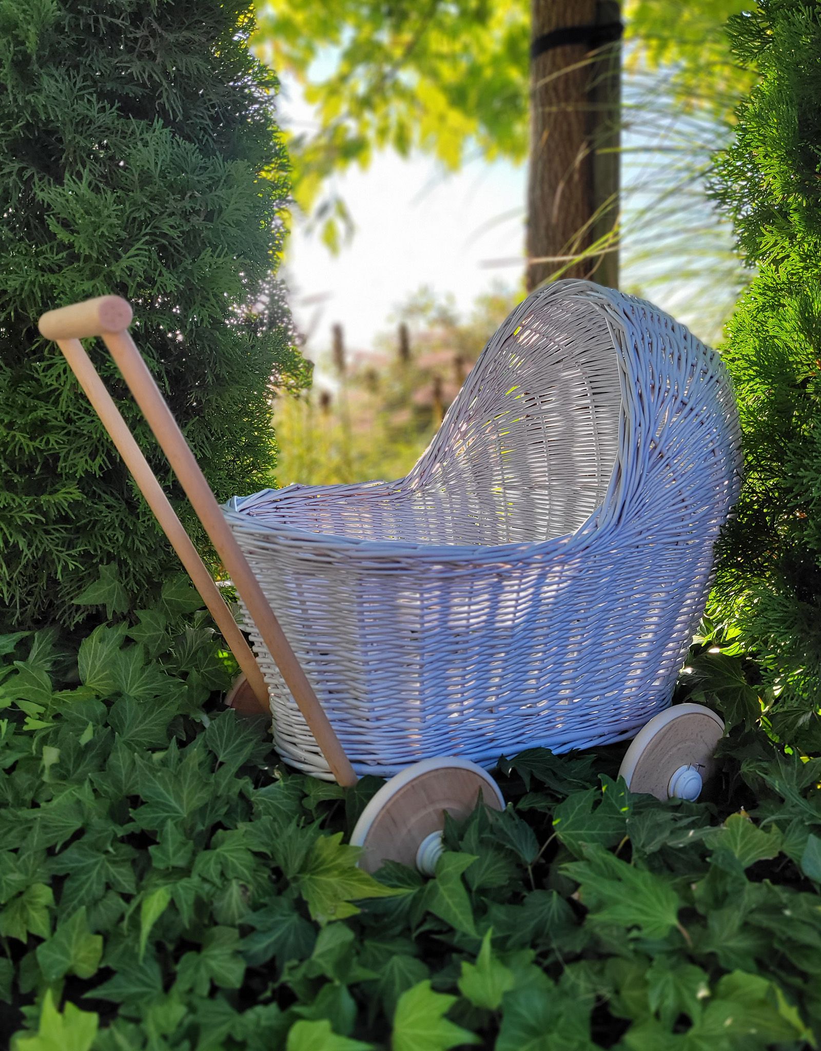 Puppenwagen aus Weidengeflecht - aus natürlichem Weidengeflecht, auf einem natürlichen Holzgestell mit Holzrädern.