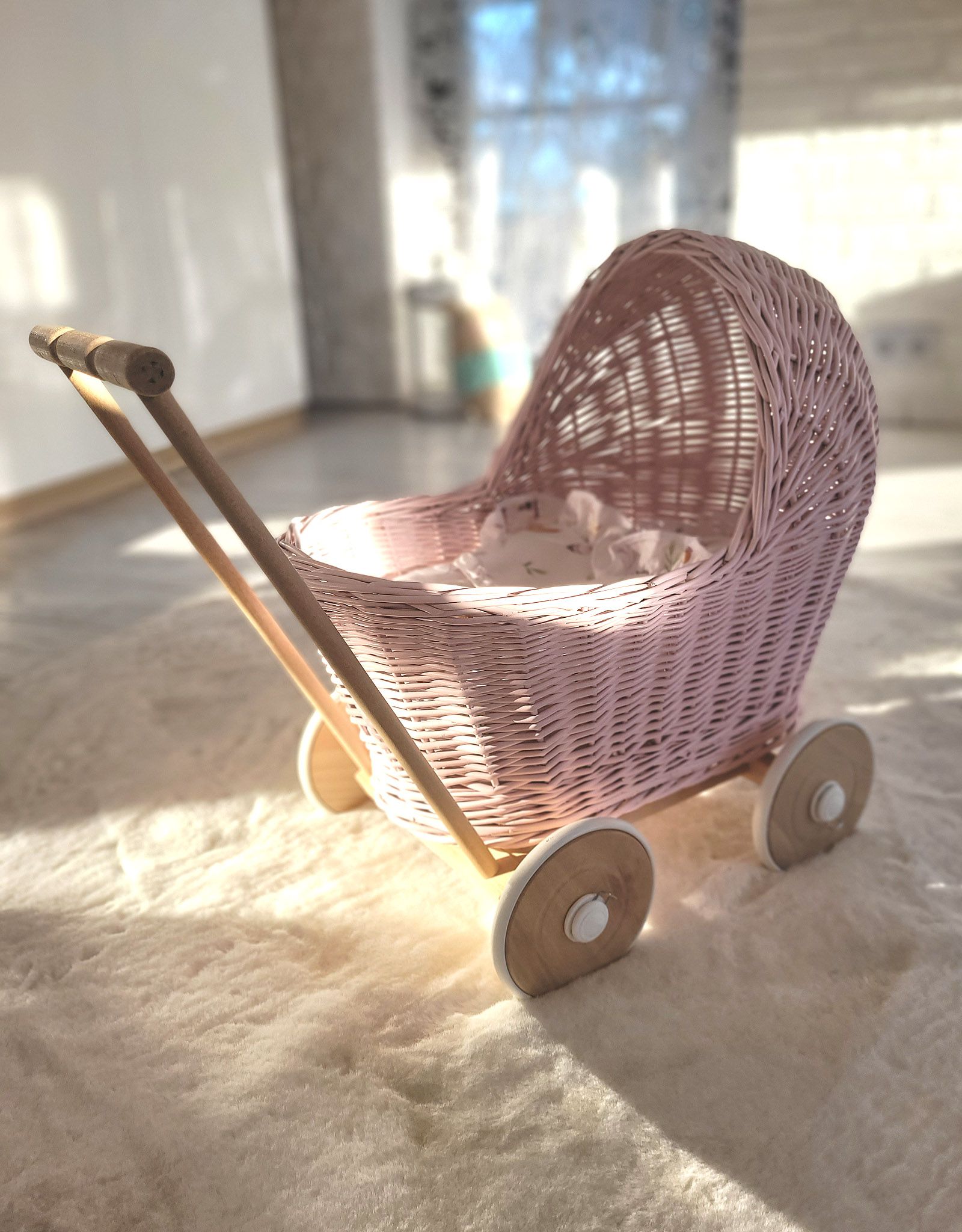 Sie können zusätzlich die Puppenbettwäsche für den Kinderwagen bestellen, separat erhältlich. Rosa Korbpuppenwagen