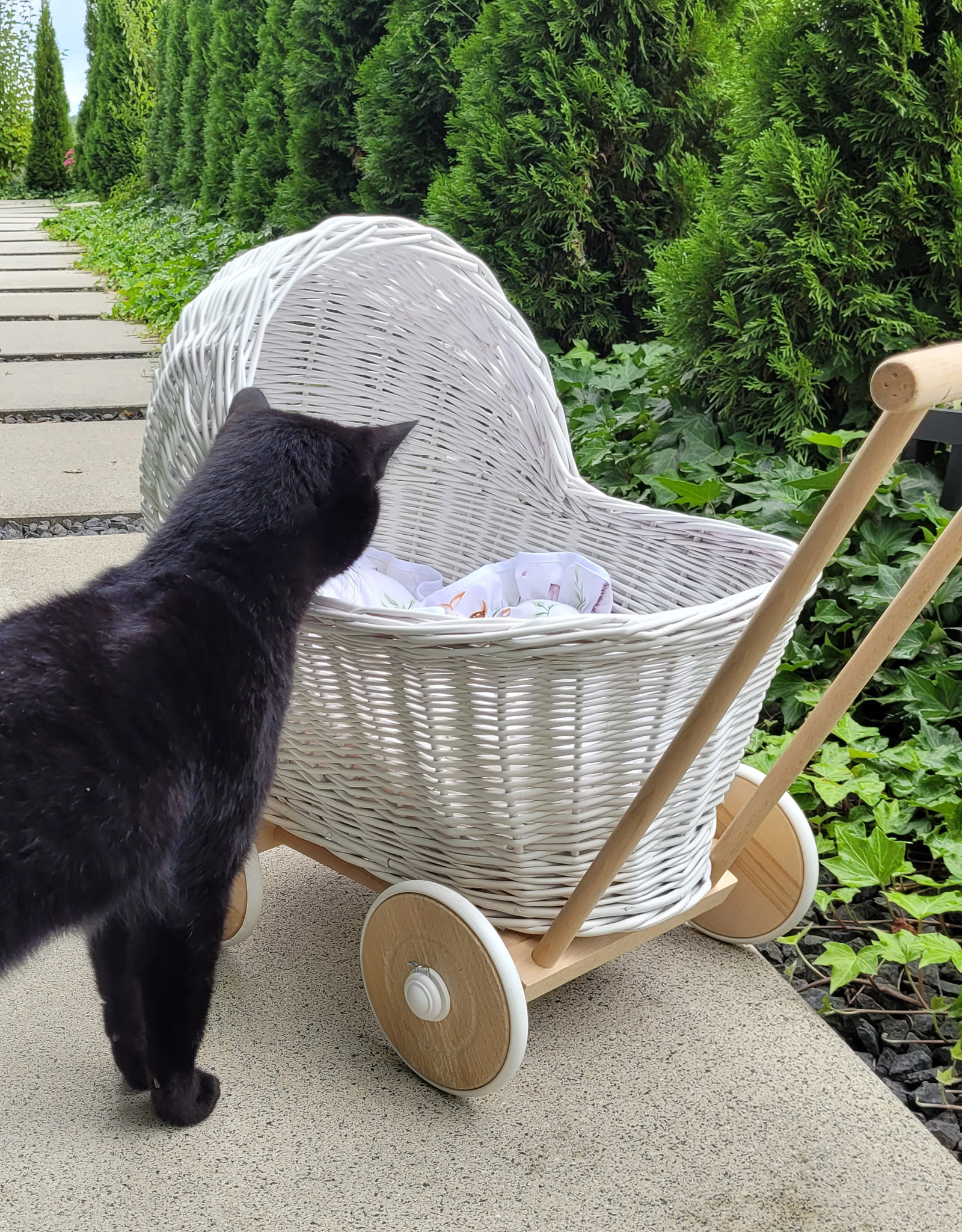 Ein tolles Geschenk für ein kleines Mädchen - ein wunderschöner Puppenwagen aus Korbgeflecht, stilvoll und einzigartig. Handgefertigter Kinderwagen, hochwertiges Kunsthandwerk. Natürliche polnische Weide aus ökologischem Anbau. Der Kinderwagen hat eine schöne runde Form. Massives Holzgestell aus natürlichem Buchenholz, Spitzenqualität. Dank des stabilen Griffs lässt sich der Kinderwagen leicht und bequem lenken. Holzräder, die durch einen Gummireifen geschützt sind. Die Räder sind auf Metallachsen montiert. Eine spezielle "Klick-Klack"-Sicherung sichert die Räder und sorgt für ein leichtes Drehen der Räder. Jedes Detail des Wagens ist in sorgfältiger Handarbeit ausgearbeitet. Außerdem wird jeder Trolley mit einer Karte geliefert, auf die Sie eine Widmung oder Wünsche schreiben können.