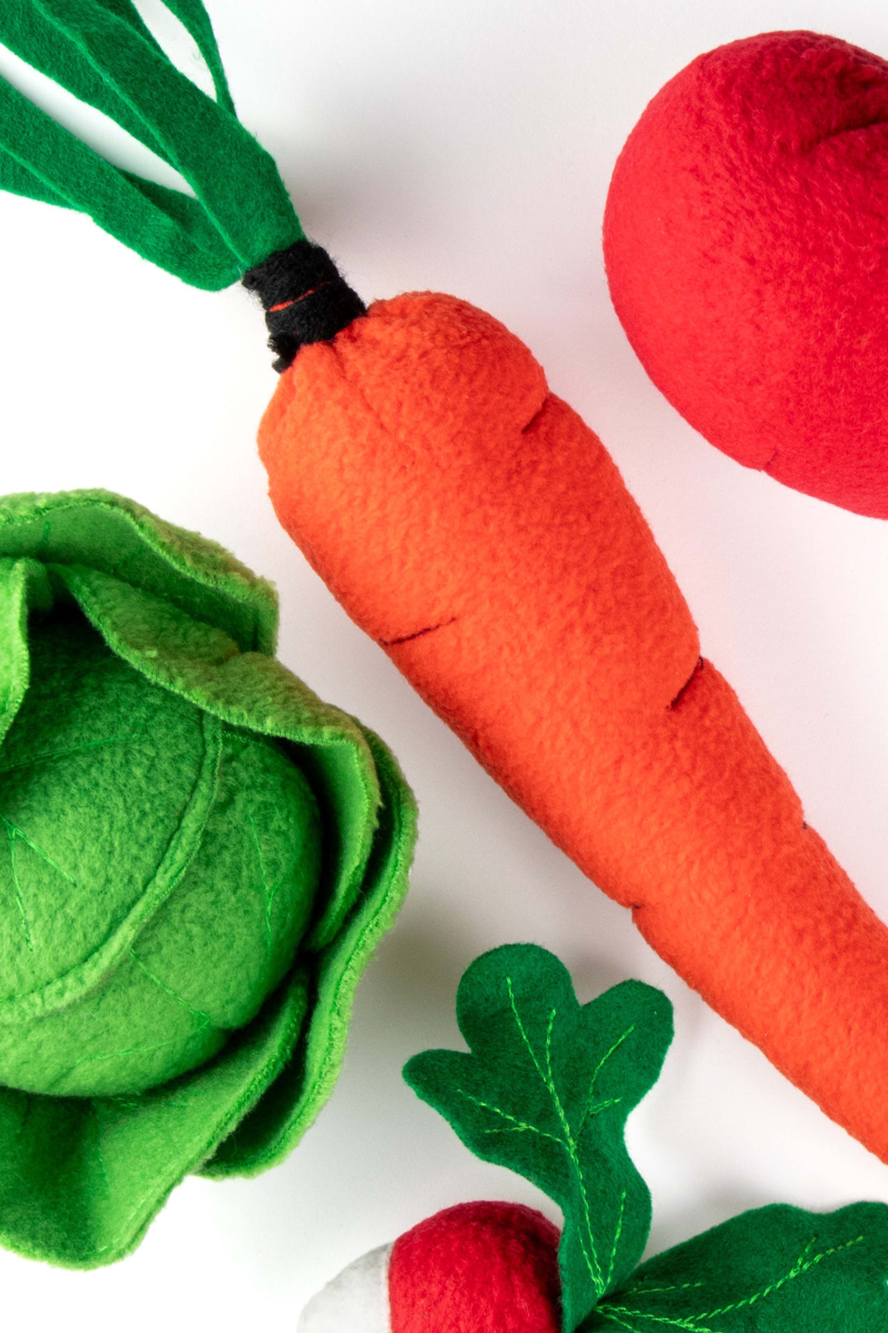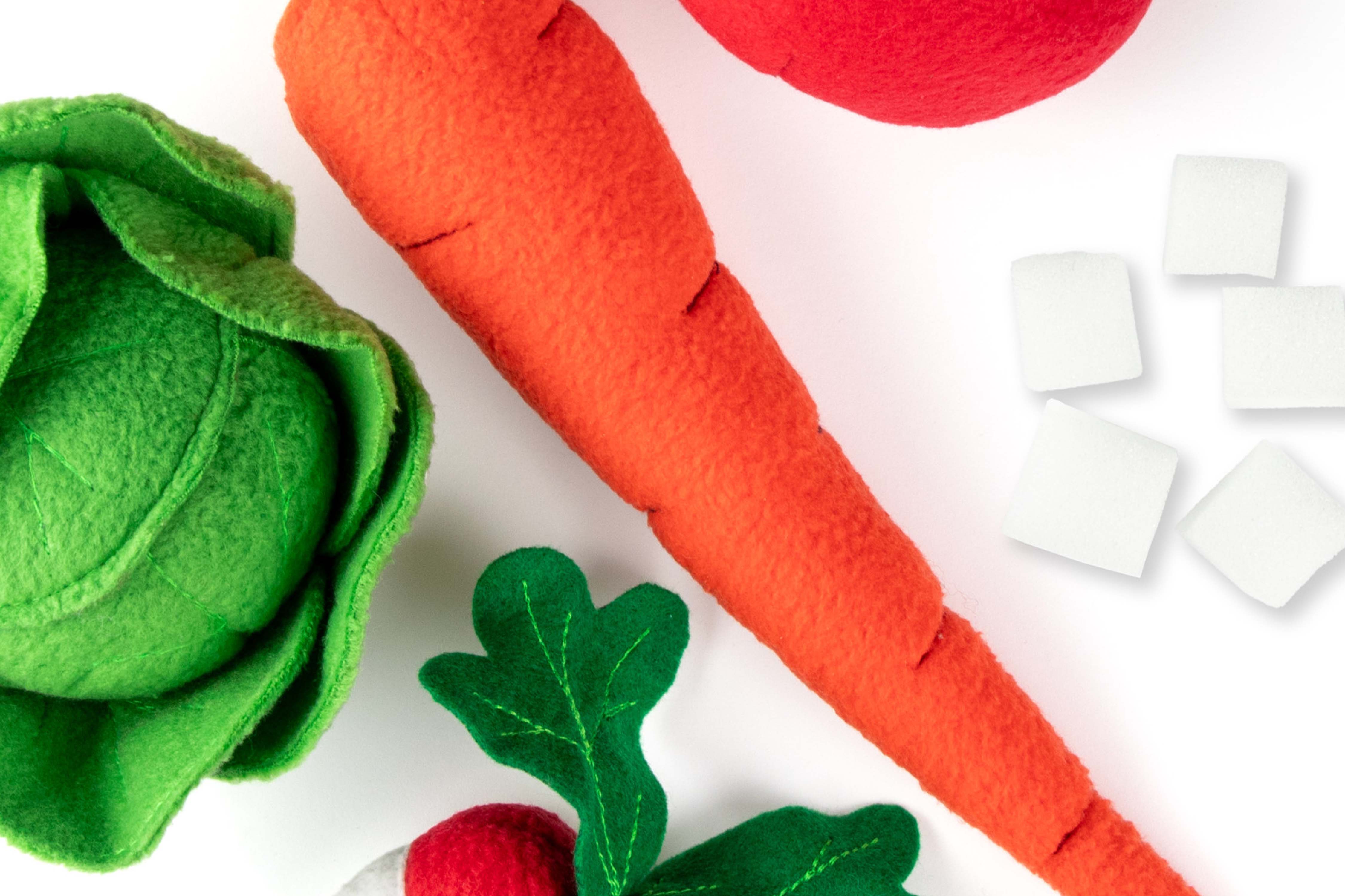 Lieferumfang: Karotte, Kohl, Apfel, Radieschen, 5 x Zuckerstücke.