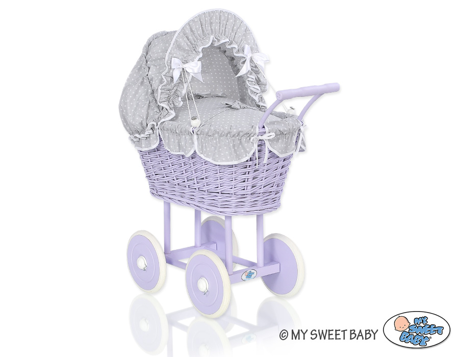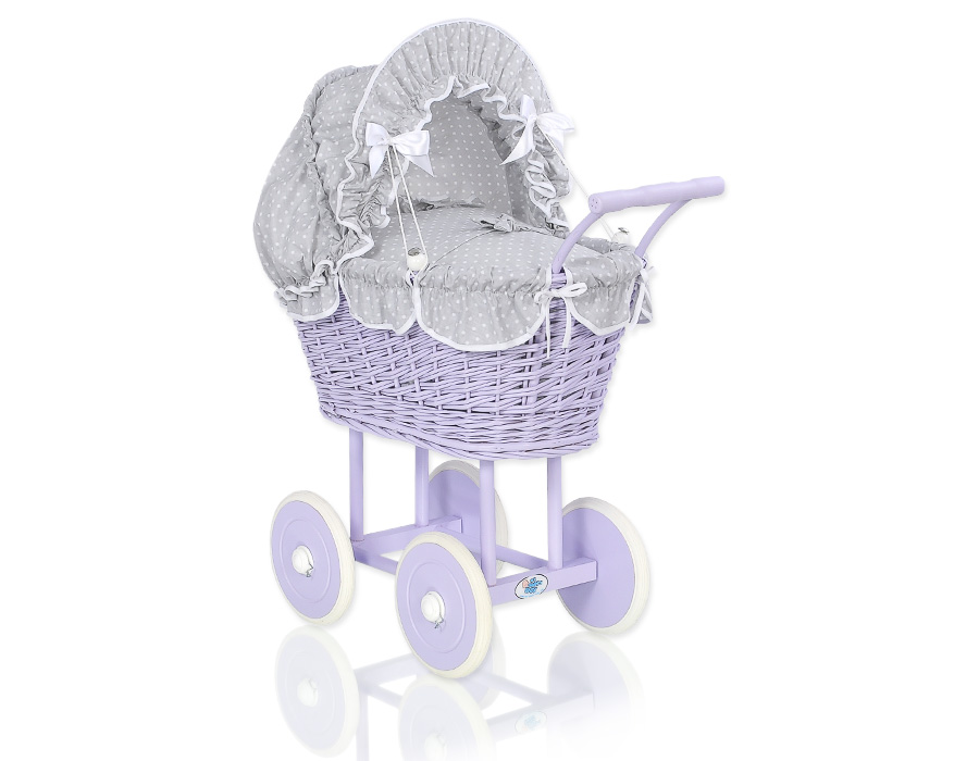 Stubenwagen » Spielzeug Kuscheltiere » Puppenwagen und Spielzeug » Puppenwagen aus Weide » Lila Weide Retro Puppenwagen Bettwäsche Grau mit Weiß Punktmuster nr 91699-535