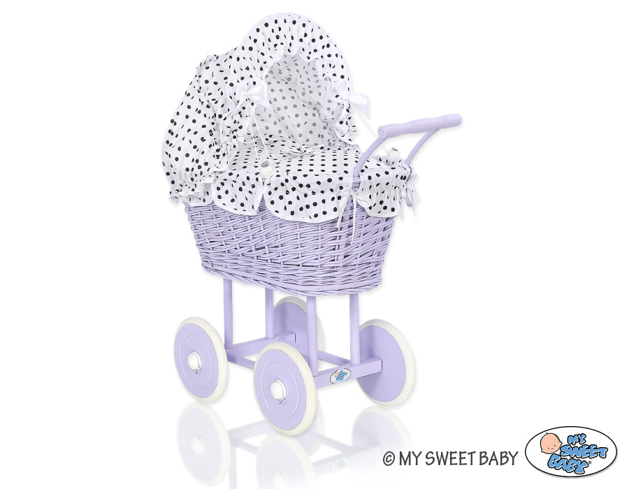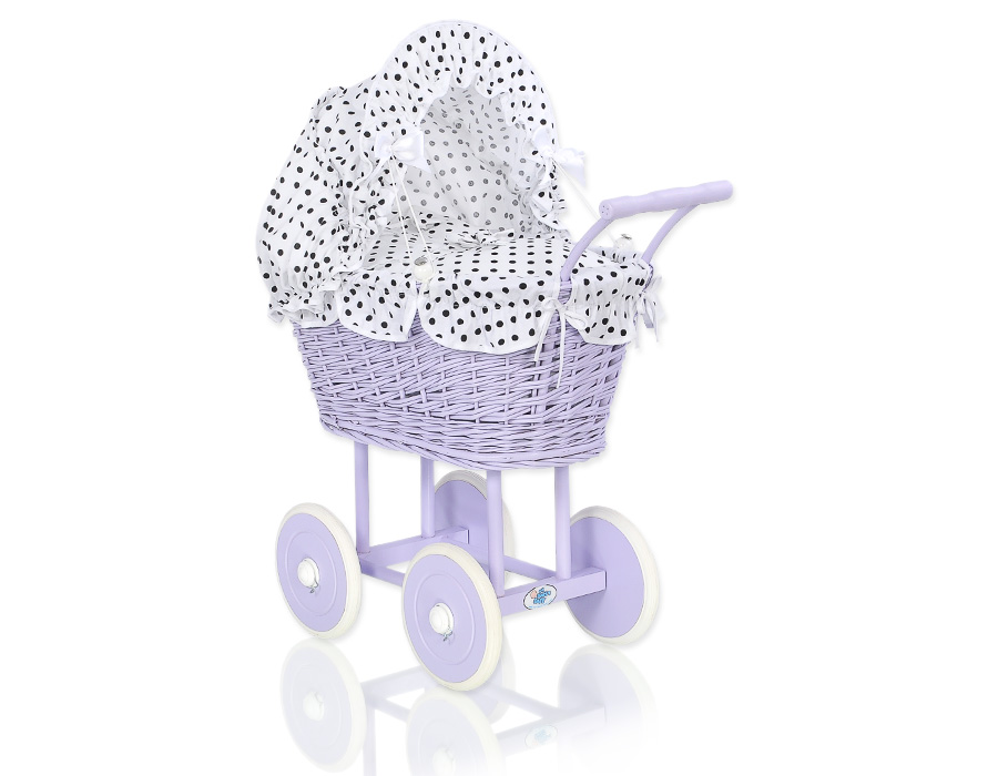 Stubenwagen » Spielzeug Kuscheltiere » Puppenwagen und Spielzeug » Puppenwagen aus Weide » Lila Weide Vintage Puppenwagen Bettwäsche Weiß mit Schwarz Punktemuster nr 91699-738