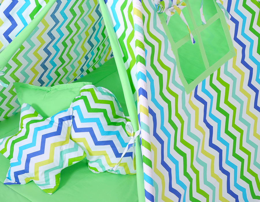 MEGA Set: Teepee Kinderspiel-Zelt+ Spielmatte+ Kissen - Chevron grün-blau