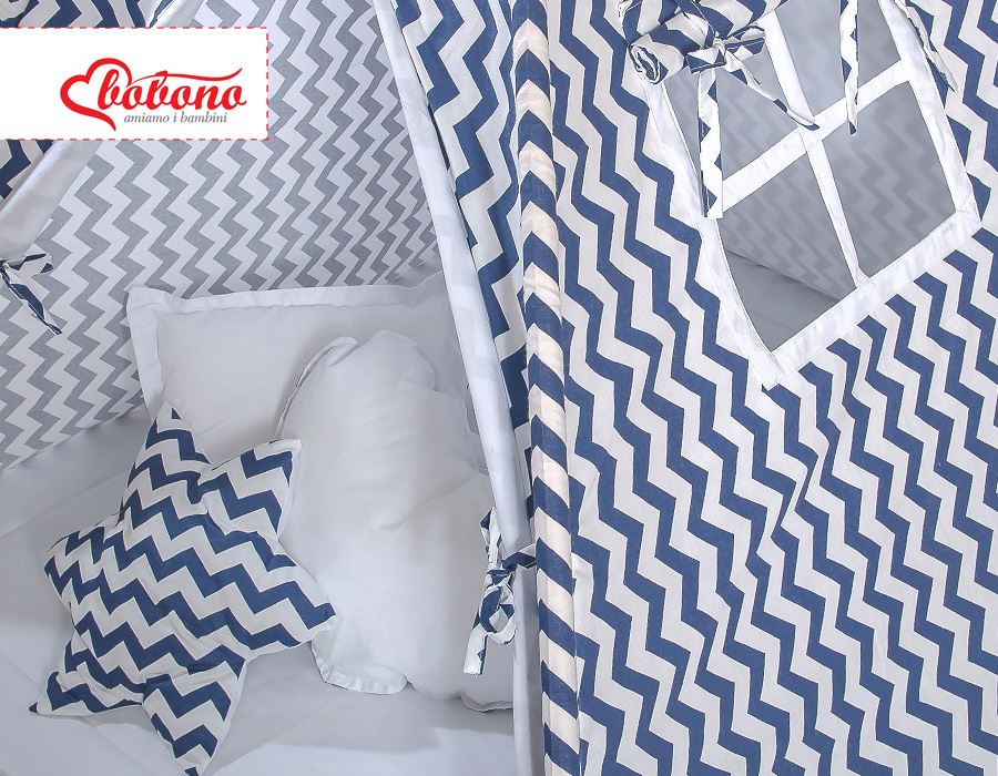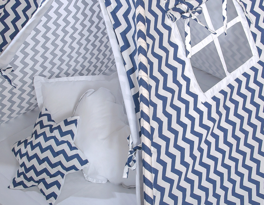 MEGA Set: Teepee Kinderspiel-Zelt+ Spielmatte+ Kissen + Schmuckfedern GRATIS! - Chevron dunkelblau