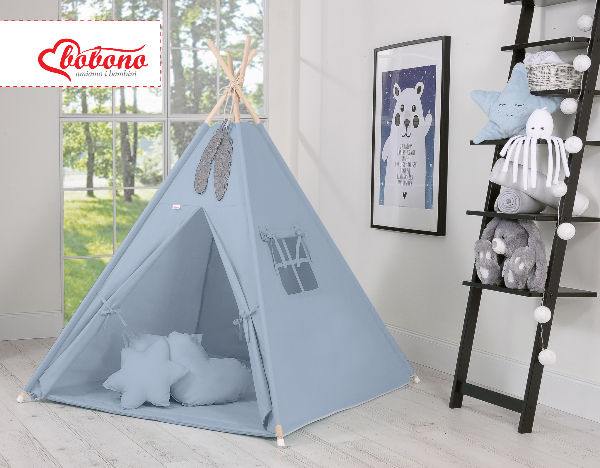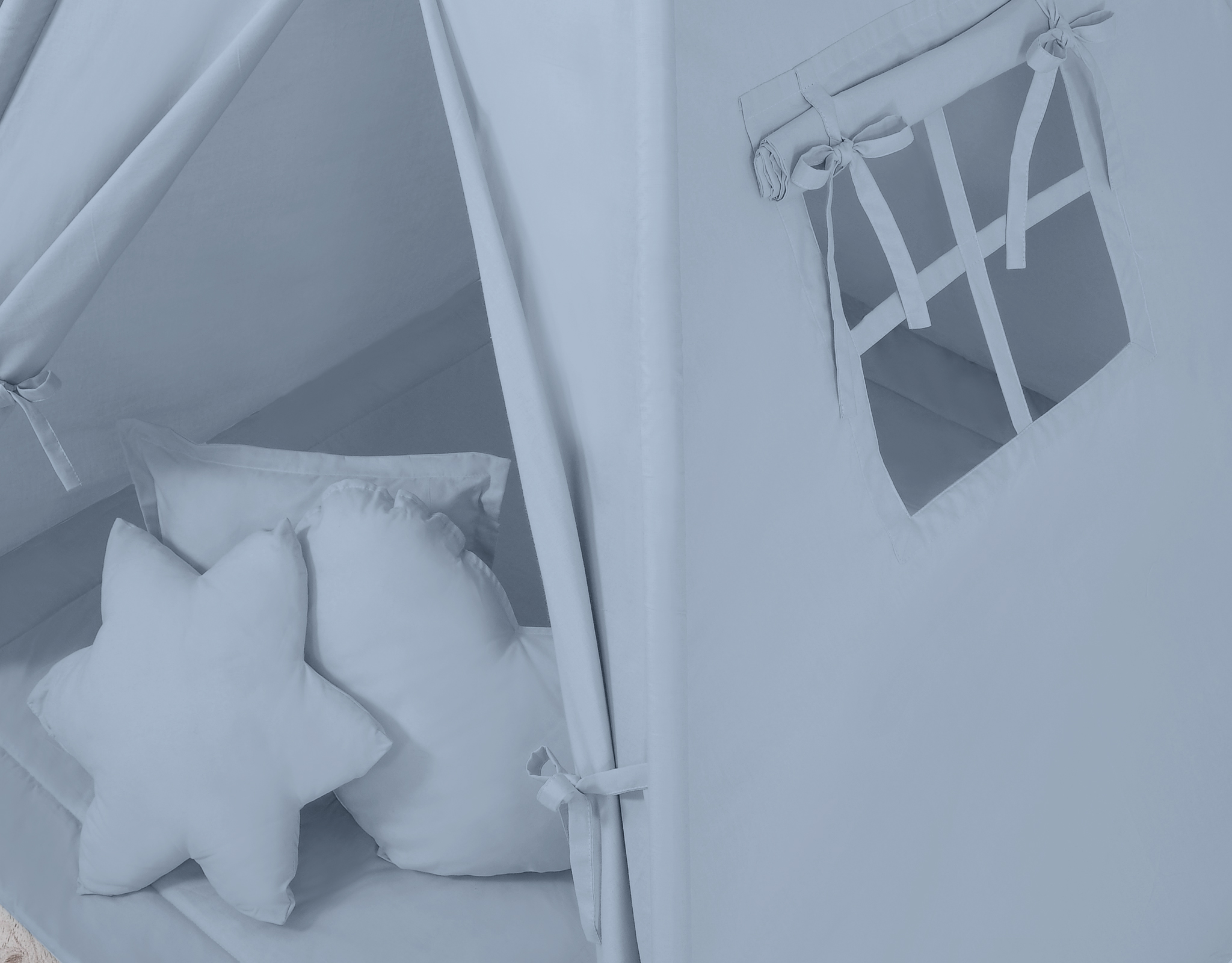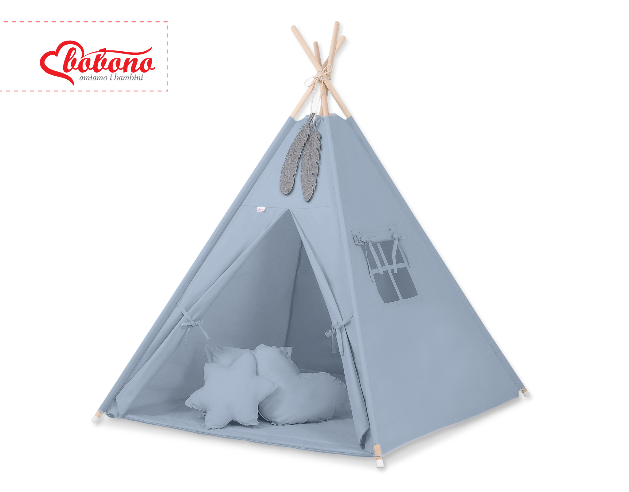 - Komplettes Zelt mit Stangen, Befestigungsschnur, Spielmatte und Kissen, zwei große Schmuckfedern aus Filz.