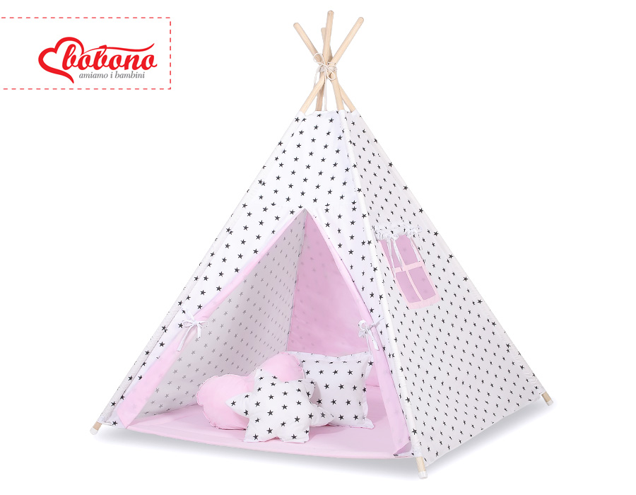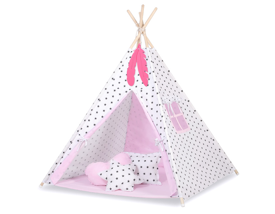 MEGA Set: Teepee Kinderspiel-Zelt+ Spielmatte+ Kissen - Schwarze Sternchen/rosa