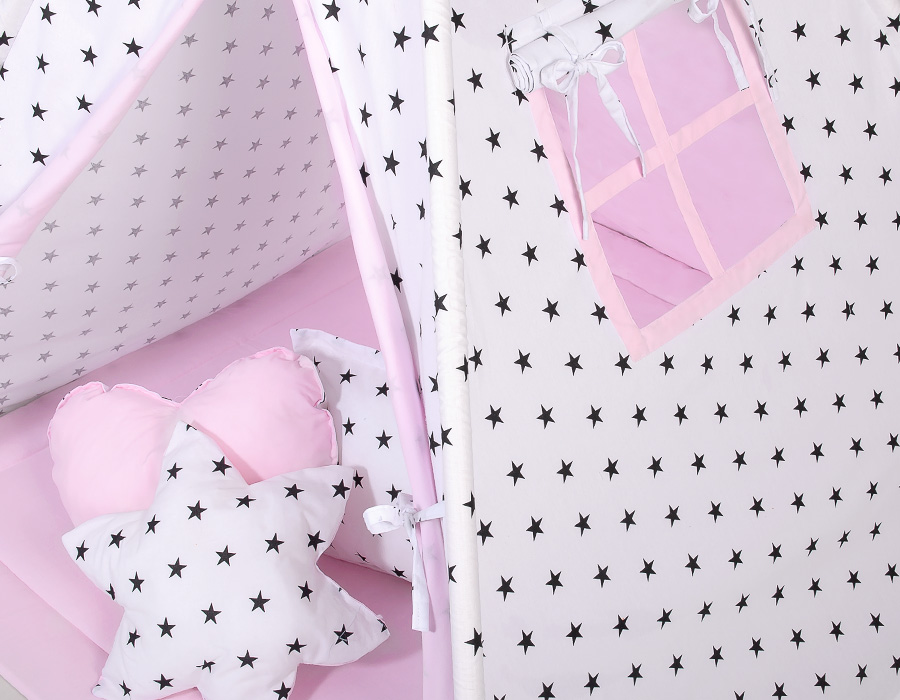 Stubenwagen » Spielzeug Kuscheltiere » Teepee Kinderspiel-Zelt » MEGA Set: Teepee Kinder Spielzelt+ Spielmatte+ Kissen » MEGA Set: Teepee Kinderspiel-Zelt+ Spielmatte+ Kissen - Schwarze Sternchen/rosa