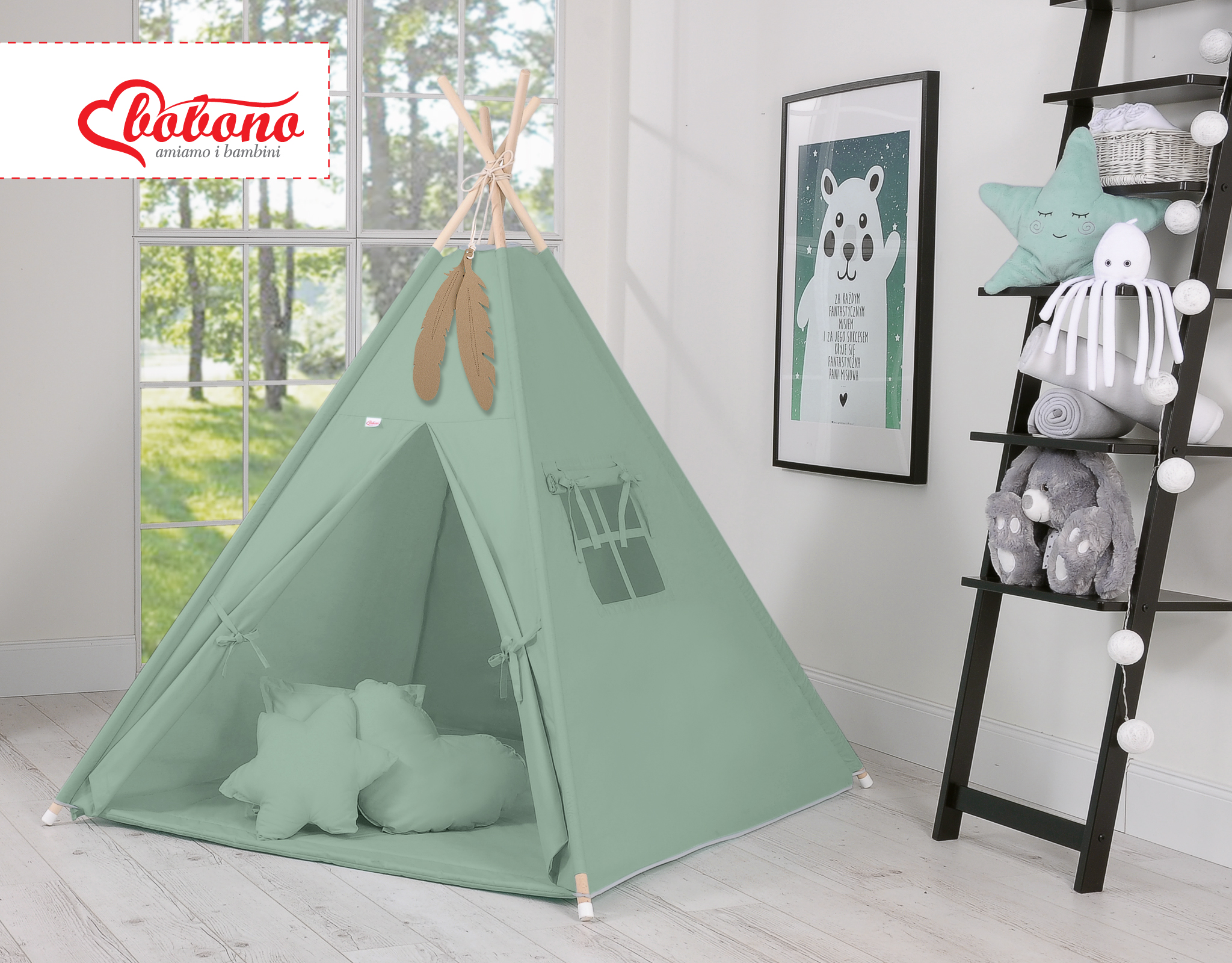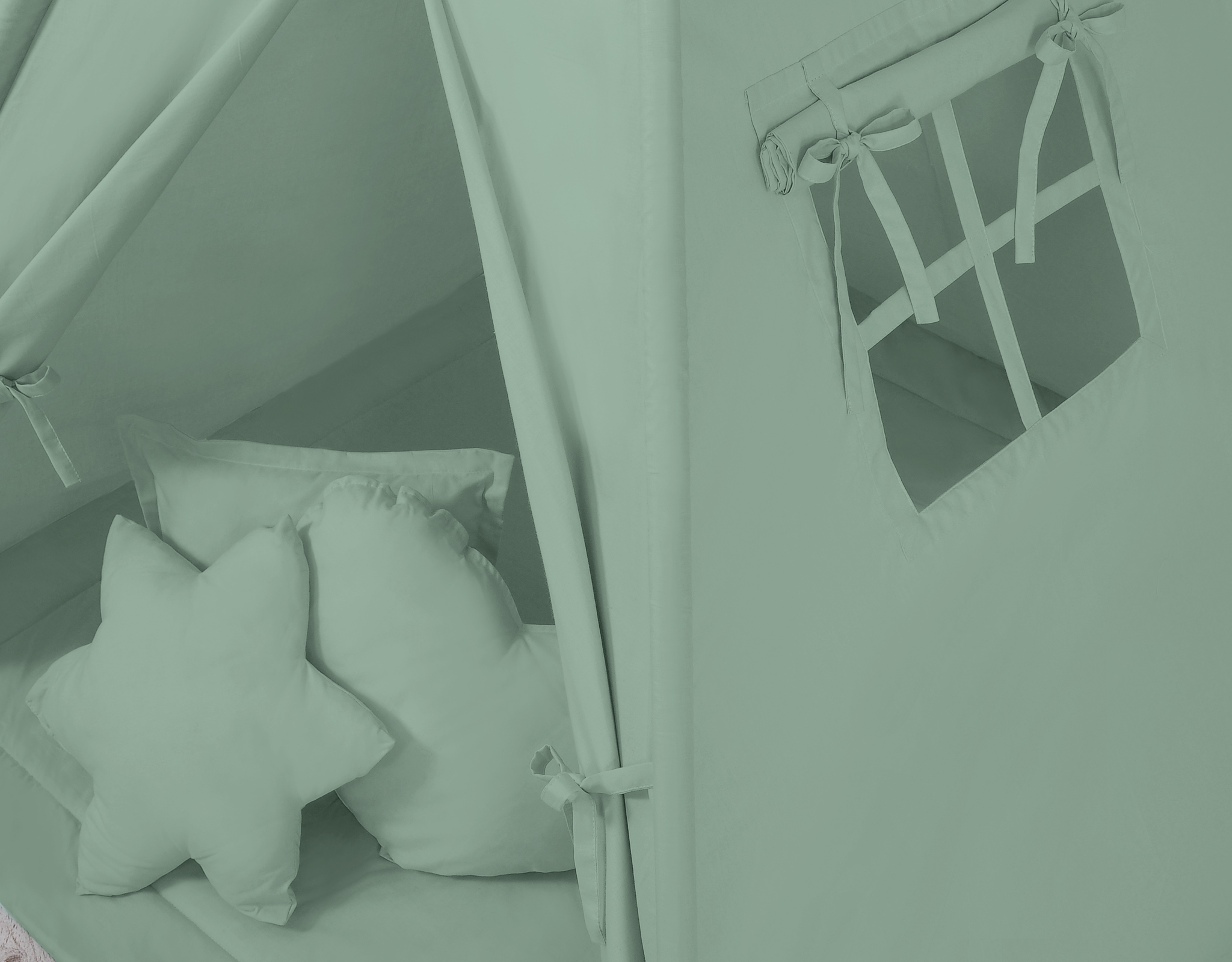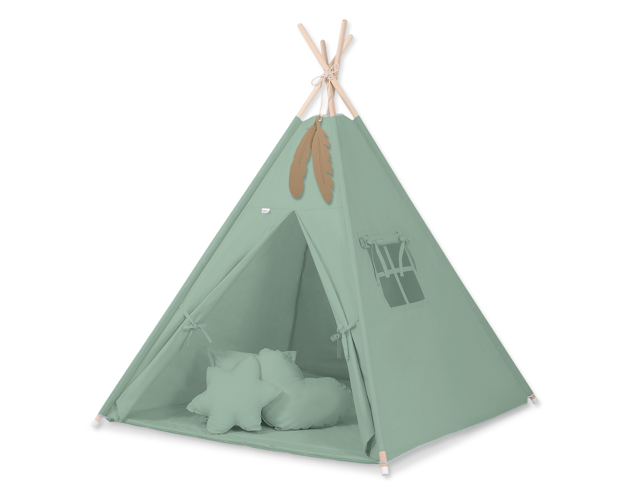 - Komplettes Zelt mit Stangen, Befestigungsschnur, Spielmatte und Kissen, zwei große Schmuckfedern aus Filz.