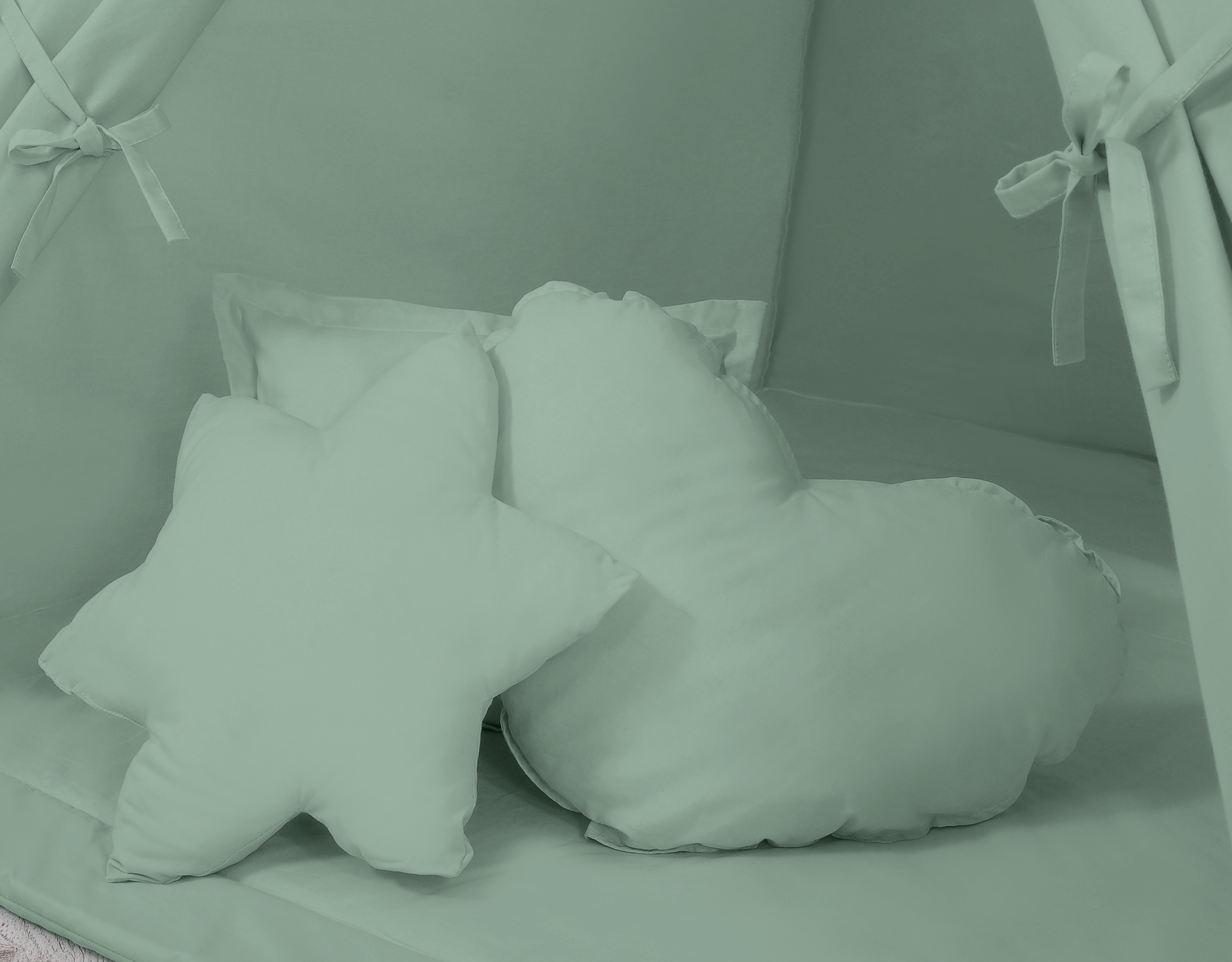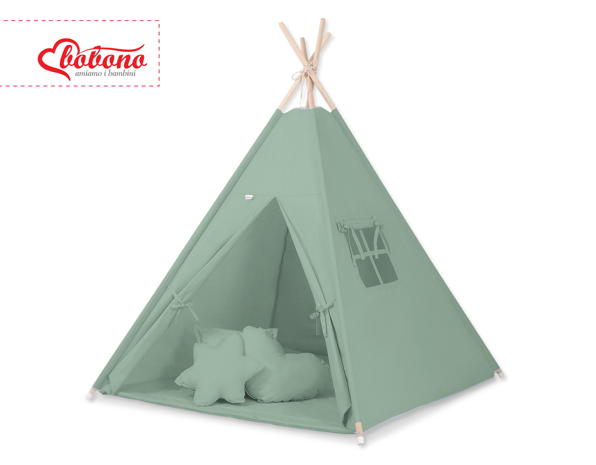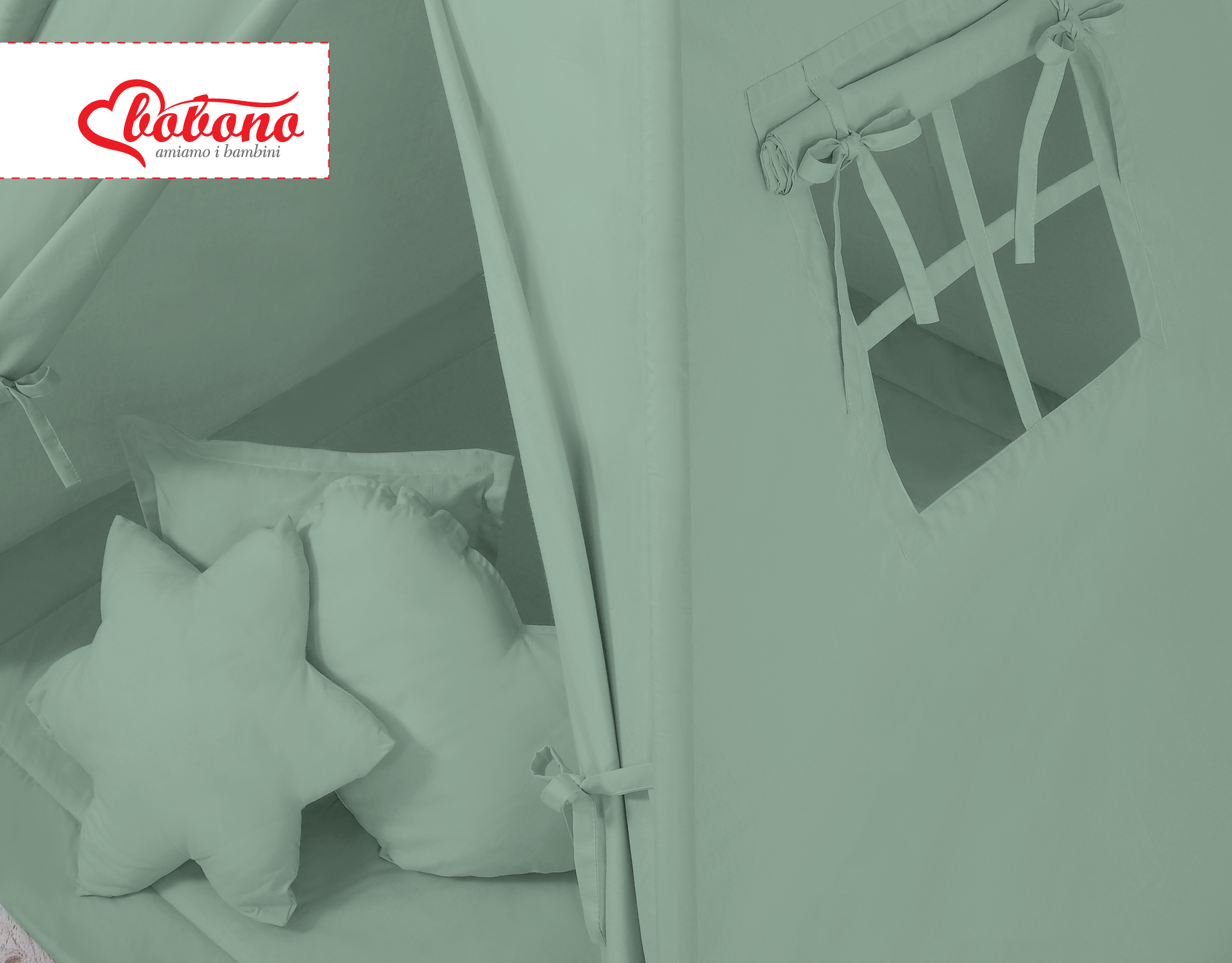 - Komplettes Zelt mit Stangen, Befestigungsschnur, Spielmatte und Kissen, zwei große Schmuckfedern aus Filz.