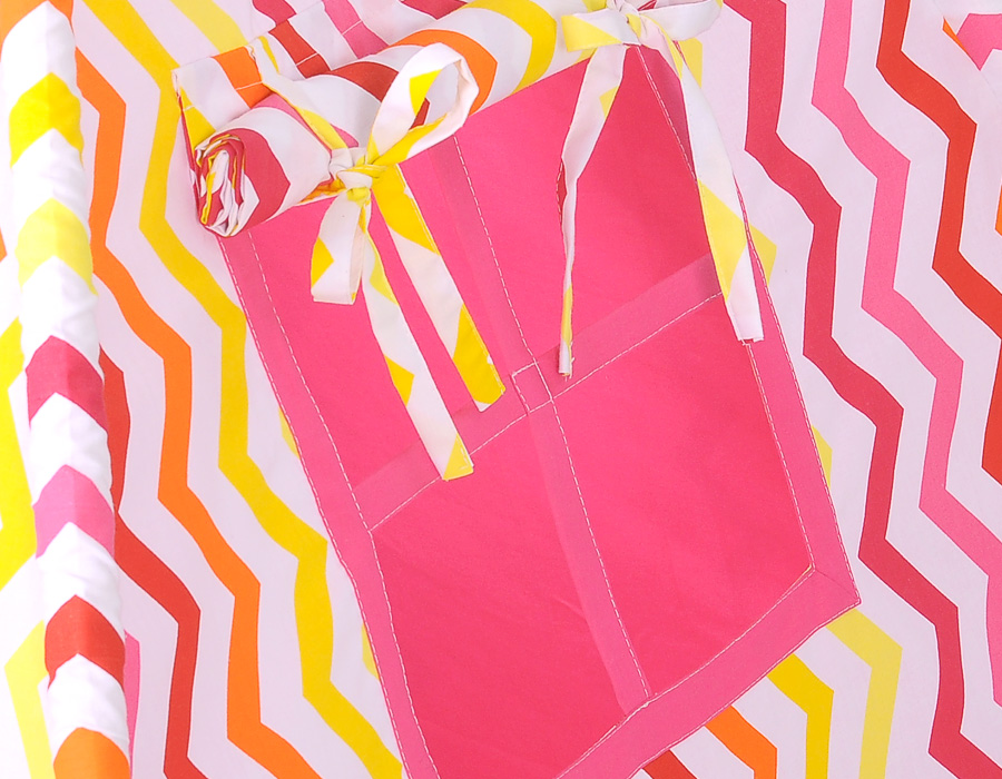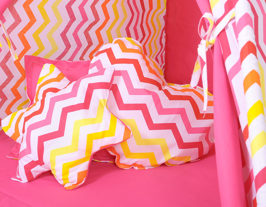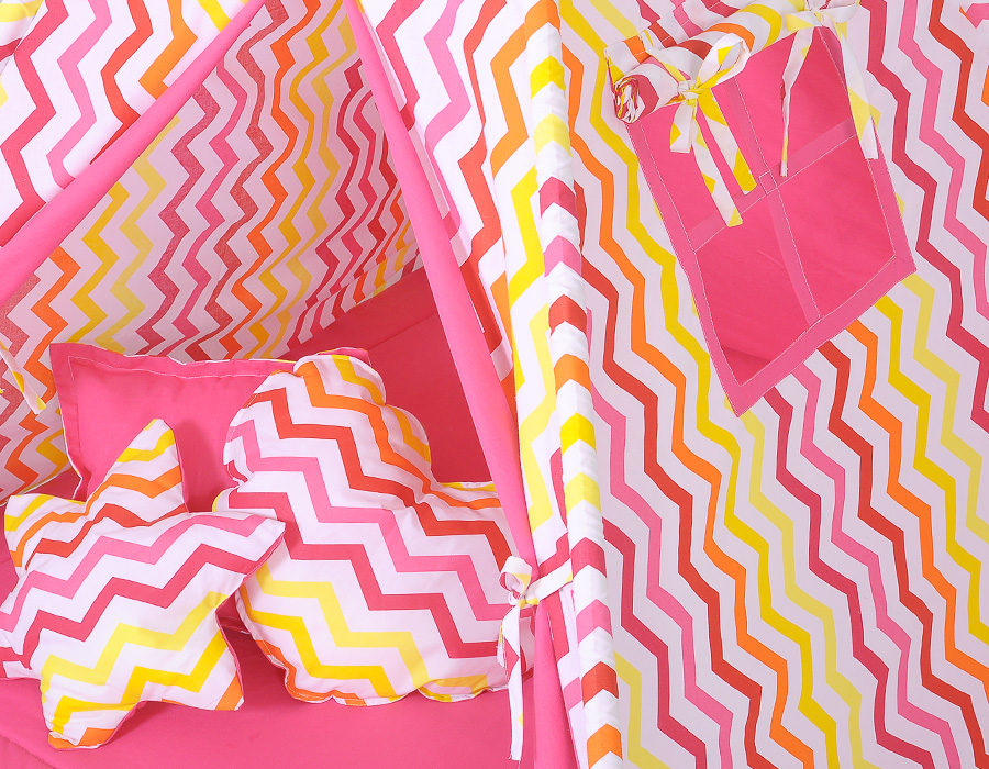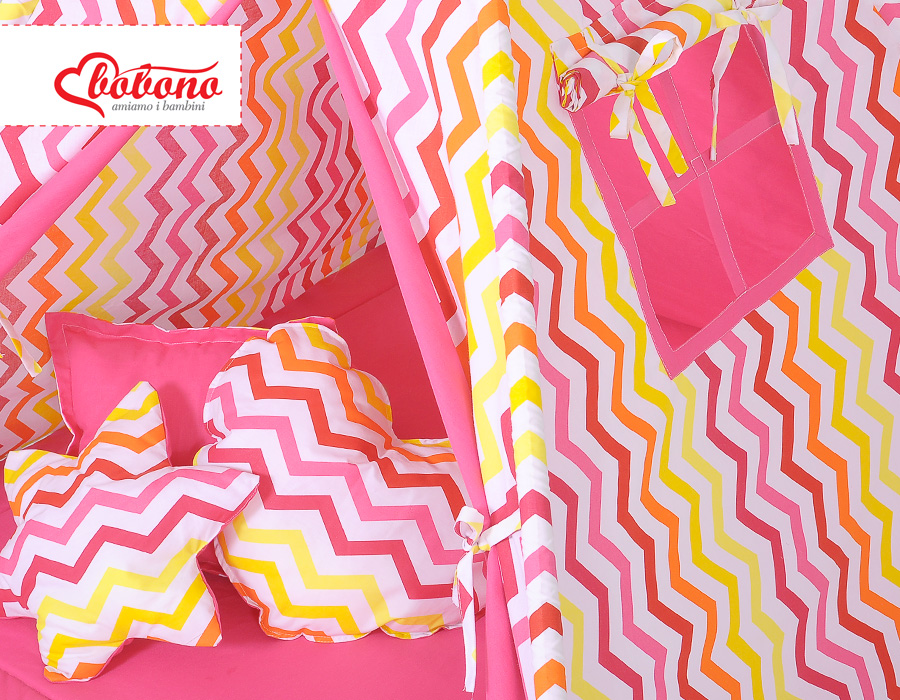 - Komplettes Zelt mit Stangen, Befestigungsschnur, Spielmatte und Kissen.