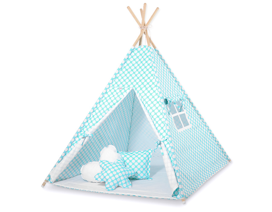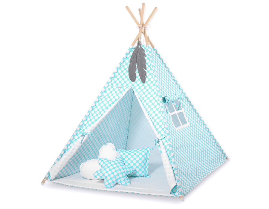 MEGA Set: Tipi Kinderspiel-Zelt+ Spielmatte+ Kissen+ Schmuckfedern GRATIS! - türkis Punkt-Muster