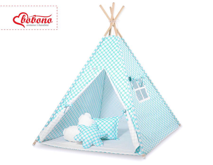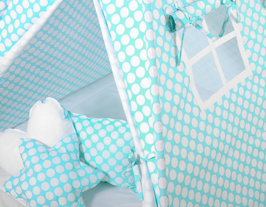MEGA Set:Tipi Kinder Spielzelt + Spielmatte+ Kissen+ Schmuckfedern GRATIS! - türkis Punkt-Muster