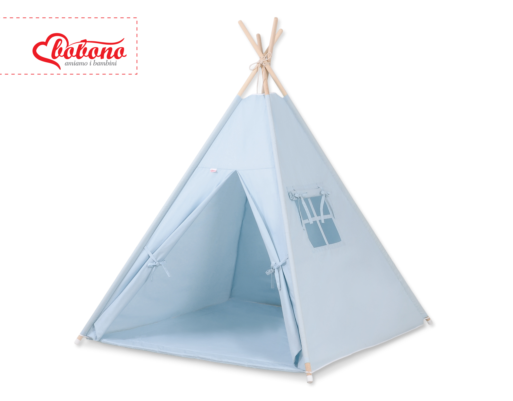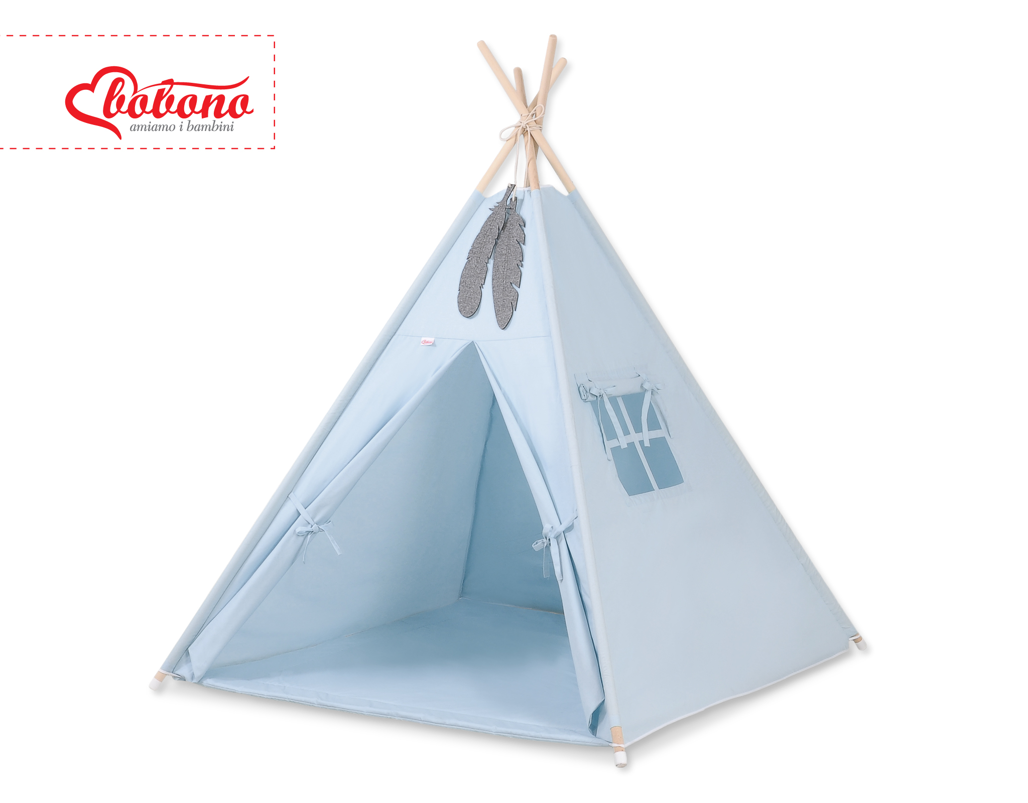 - Komplettes Zelt mit Holzstangen Befestigungsschnur, Spielmatte, zwei große Schmuckfedern aus Filz.